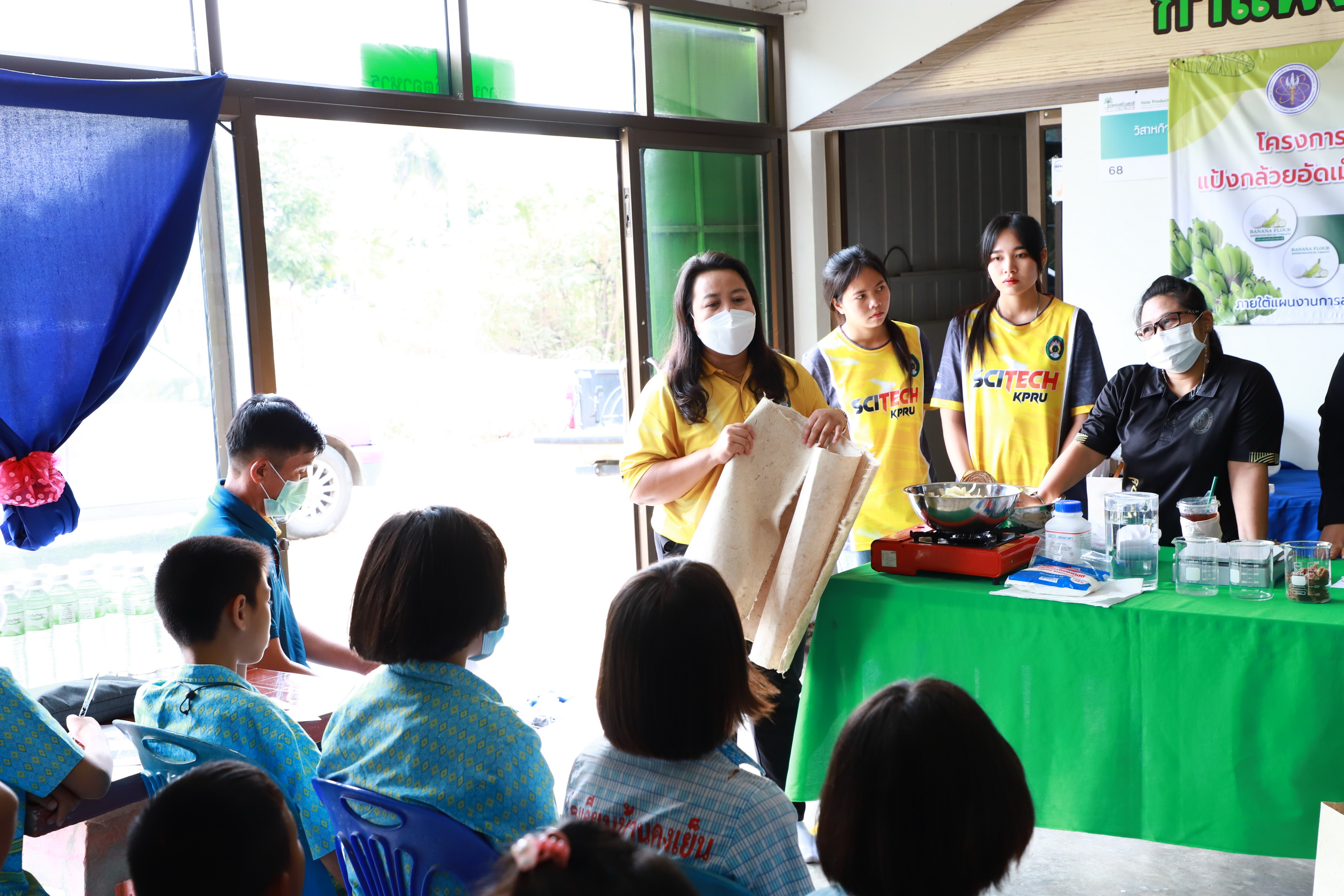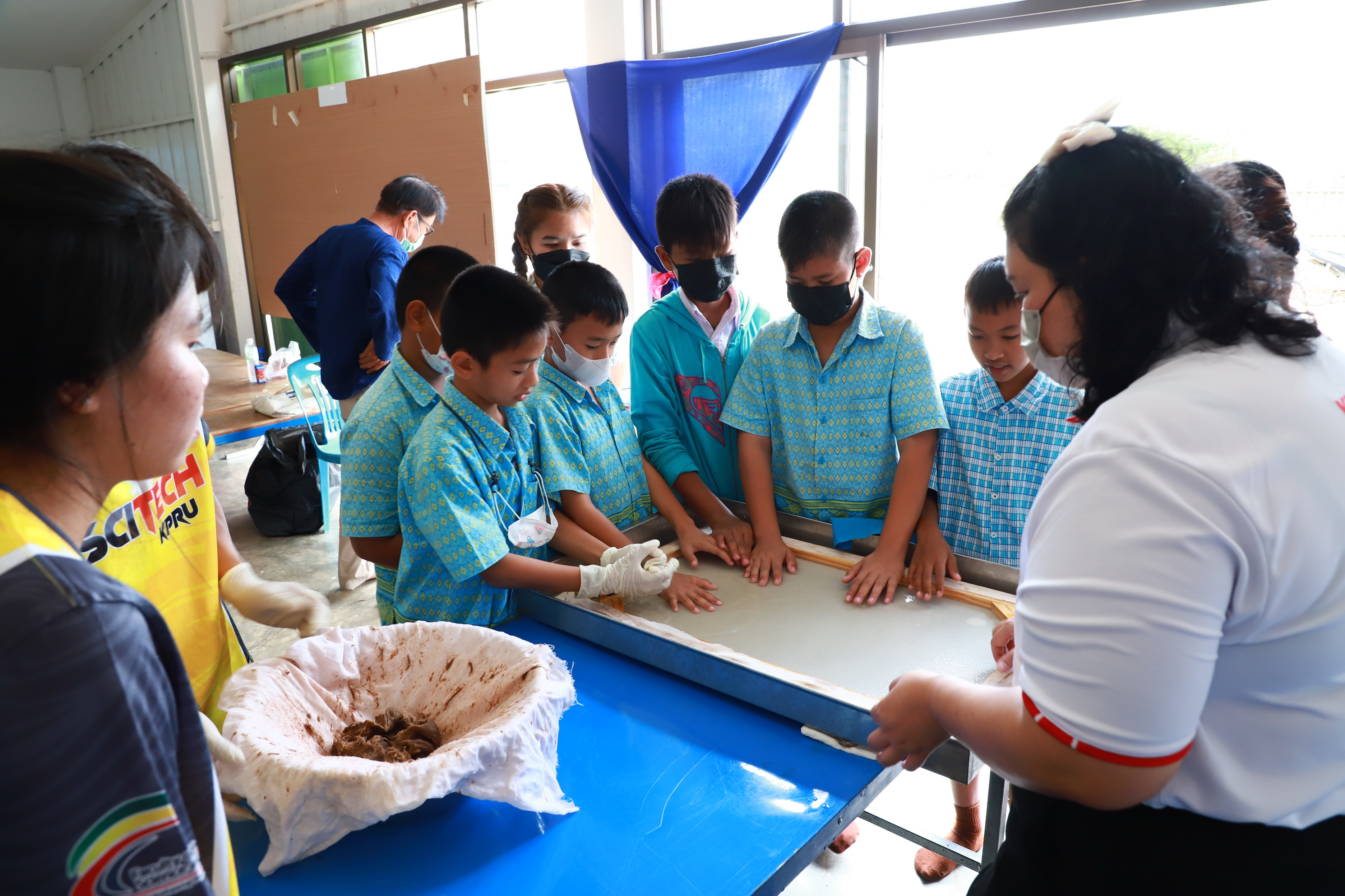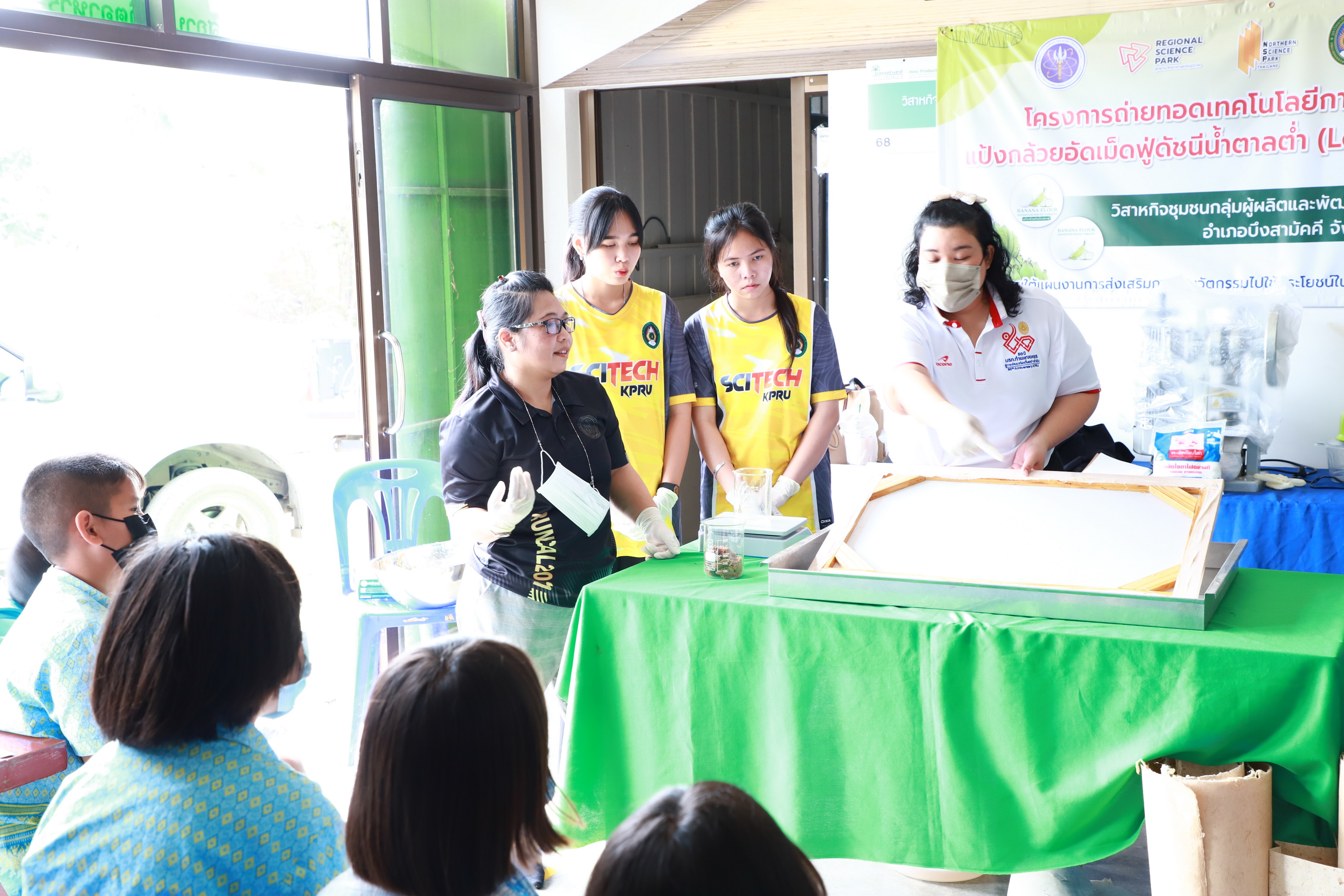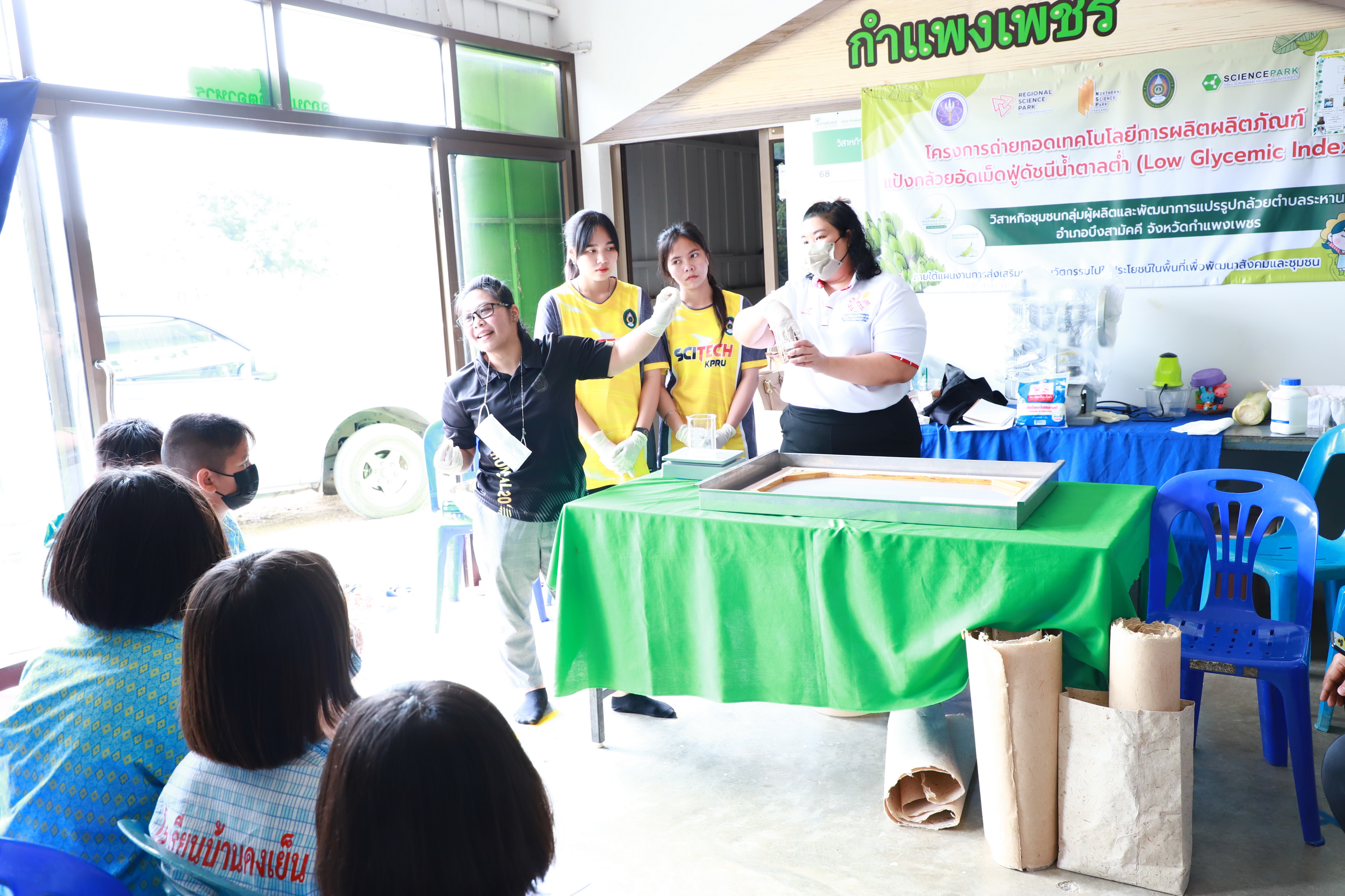 คณะวิทยาศาสตร์และเทคโนโลยี จัดกิจกรรมถ่ายทอดองค์ความรู้กระดาษกันนาจากกาบกล้วยไข่เพื่อใช้ในงานบรรจุภัณฑ์ ให้กับกลุ่มวิสาหกิจชุมชนการแปรรูปกล้วย ตำบลระหาน อำเภอสามัคคี จังหวัด กำแพงเพชร ในวันที่ 17 กุมภาพันธ์ 2566 เวลา 08.30-16.30 น. ณ กลุ่มวิสาหกิจชุมชนการแปรรูปกล้วย ตำบลระหาน อำเภอสามัคคี จังหวัด กำแพงเพชร วิทยากรโดยอาจารย์คณะวิทยาศาสตร์และเทคโนโลยี