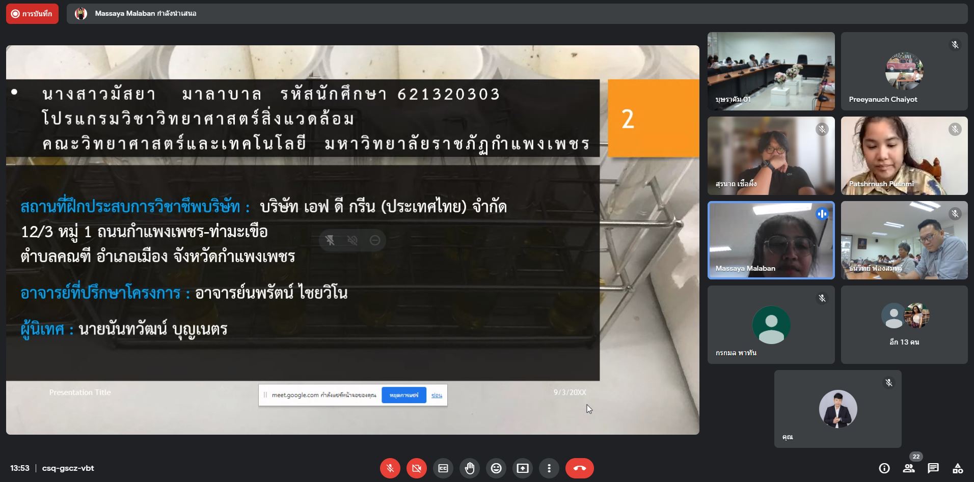 คณาจารย์ บุคลากร และนักศึกษา คณะวิทยาศาสตร์และเทคโนโลยี เข้าร่วมนำเสนอผลงานในโครงการส่งเสริมสนับสนุนการฝึกประสบการณ์วิชาชีพ/สหกิจศึกษาให้แก่นักศึกษา จากมูลนิธิเอเชีย ประเทศไทย ในวันที่ 20 มีนาคม 2566 ณ ห้องประชุมบุษราคัม ชั้น 1 อาคารเฉลิมพระเกียรติ มหาวิทยาลัยราชภัฎกำแพงเพชร แม่สอด และผ่านระบบออนไลน์ Google Meet โดยมีผู้บริหารของคณะวิทยาศาสตร์และเทคโนโลยีได้แลกเปลี่ยนและทำเสนอที่มาและความสำคัญของโครงการส่งเสริมสนับสนุนการฝึกประสบการณ์วิชาชีพ/สหกิจศึกษาให้แก่นักศึกษากิจกรรมเงินสนับสนุนการฝึกประสบการณ์วิชาชีพ/สหกิจศึกษาให้แก่นักศึกษา ประจำปีงบประมาณ 2566 และผลการดำเนินโครงการ ซึ่งในปีนี้ มีนักศึกษาได้รับทุนสนับสนุน จำนวน 6 โครงการ ประกอบด้วย