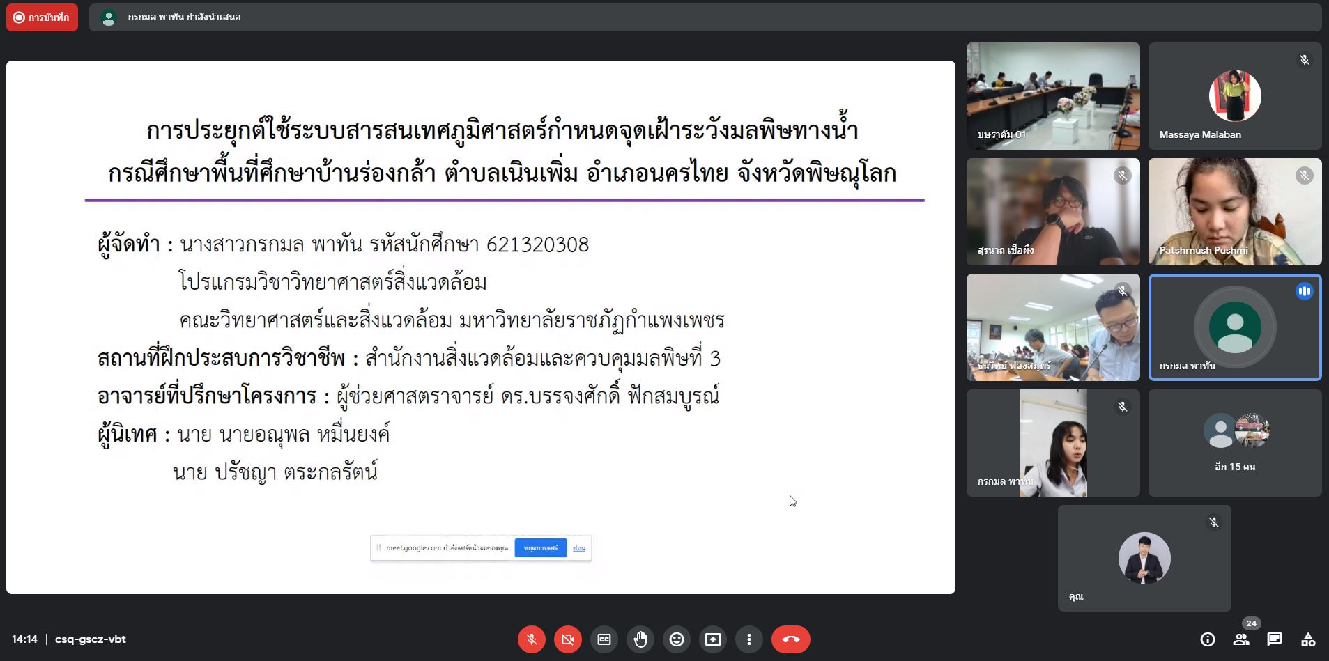 3.นางสาวกรกมล พาทัน สาขาวิชา วิทยาศาสตร์สิ่งแวดล้อม เรื่อง การประยุกต์ใช้ระบบสารสนเทศภูมิศาสตร์กำหนดจุดเฝ้าระวังมลพิษทางน้ำ กรณีศึกษาพื้นที่ศึกษาบ้านร่องกล้า ตำบลเนินเพิ่ม อำเภอนครไทย จังหวัดพิษณุโลก