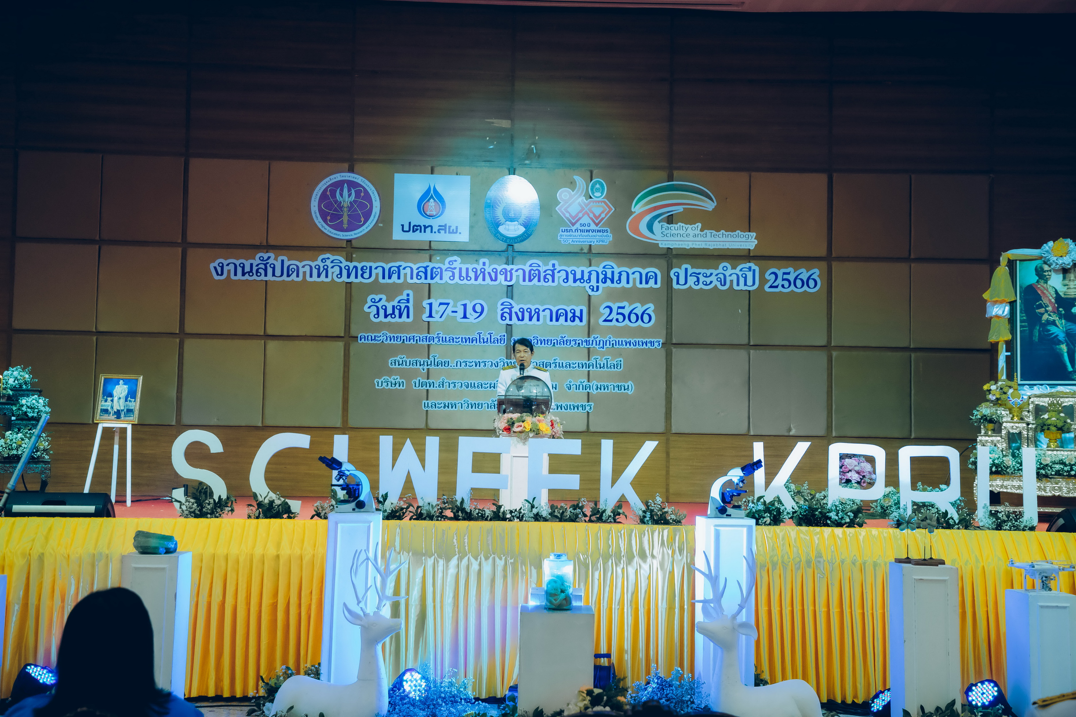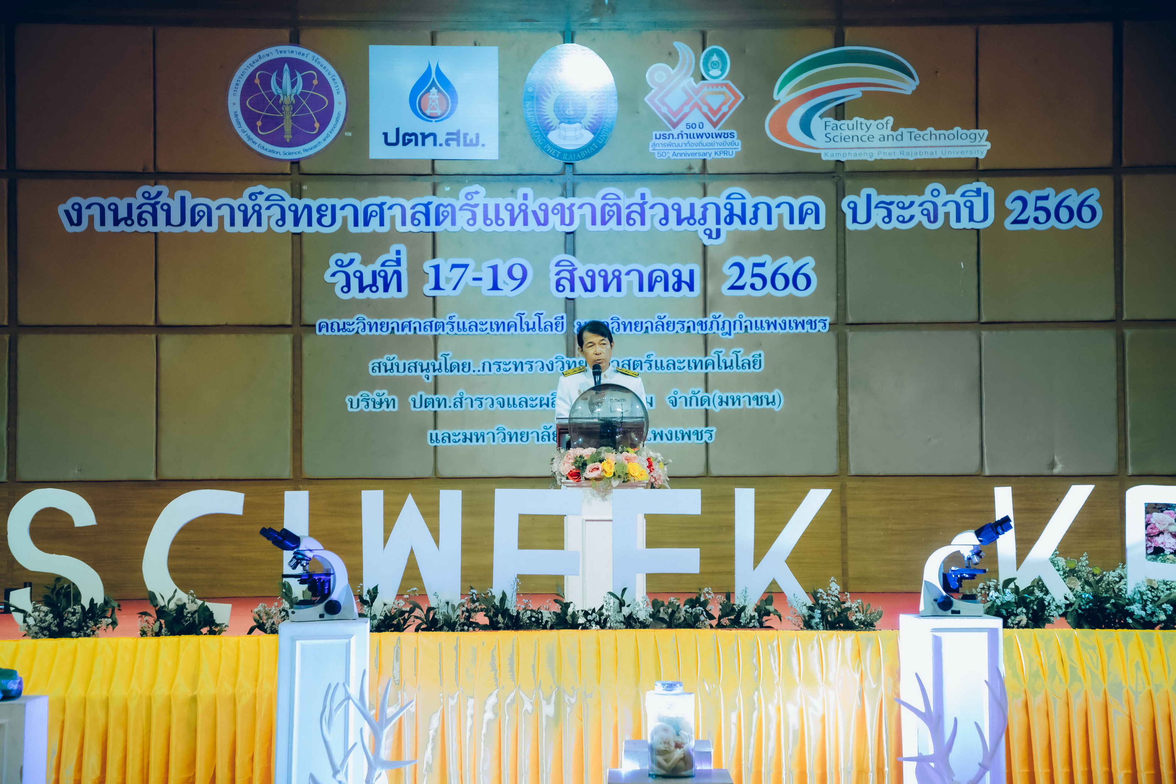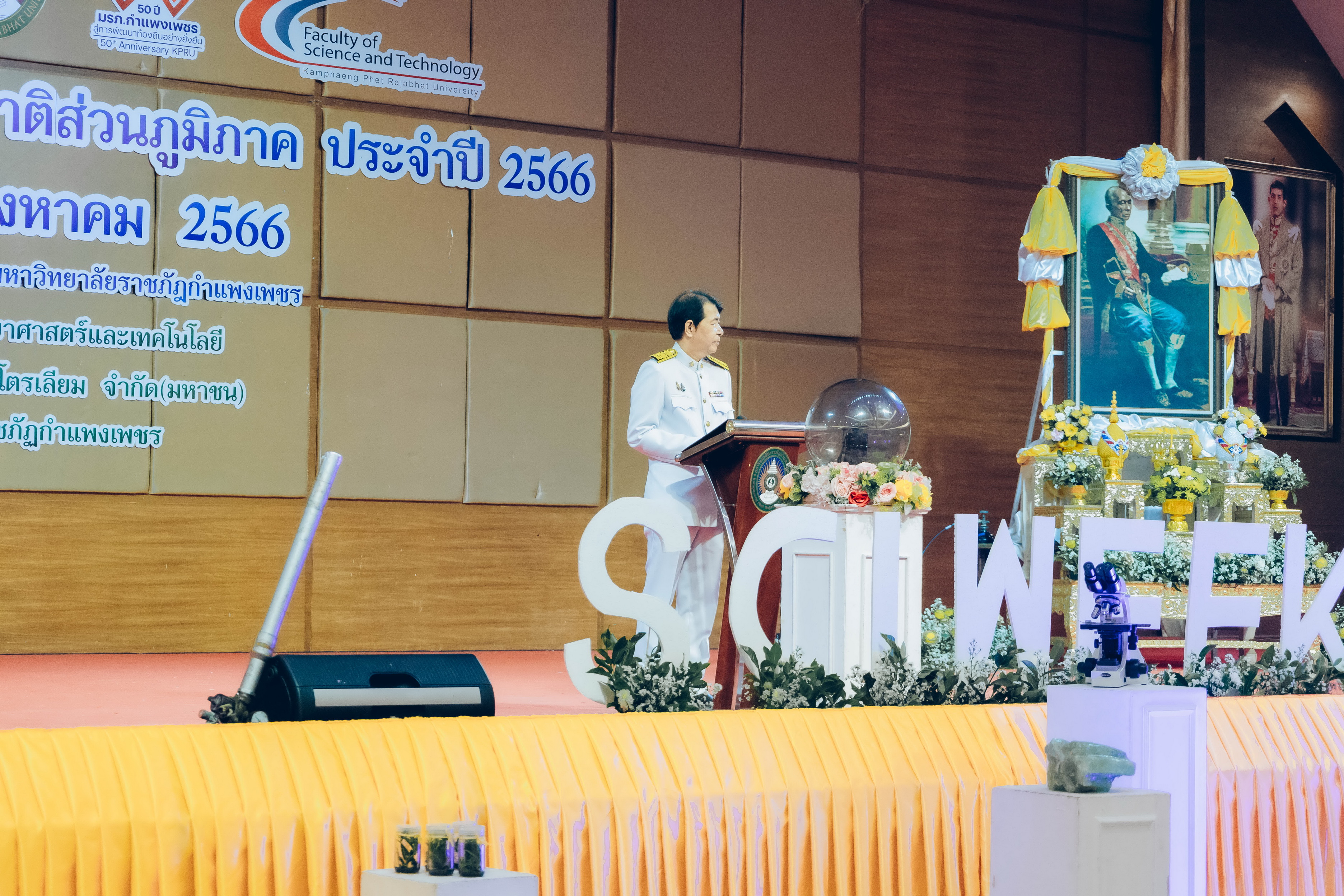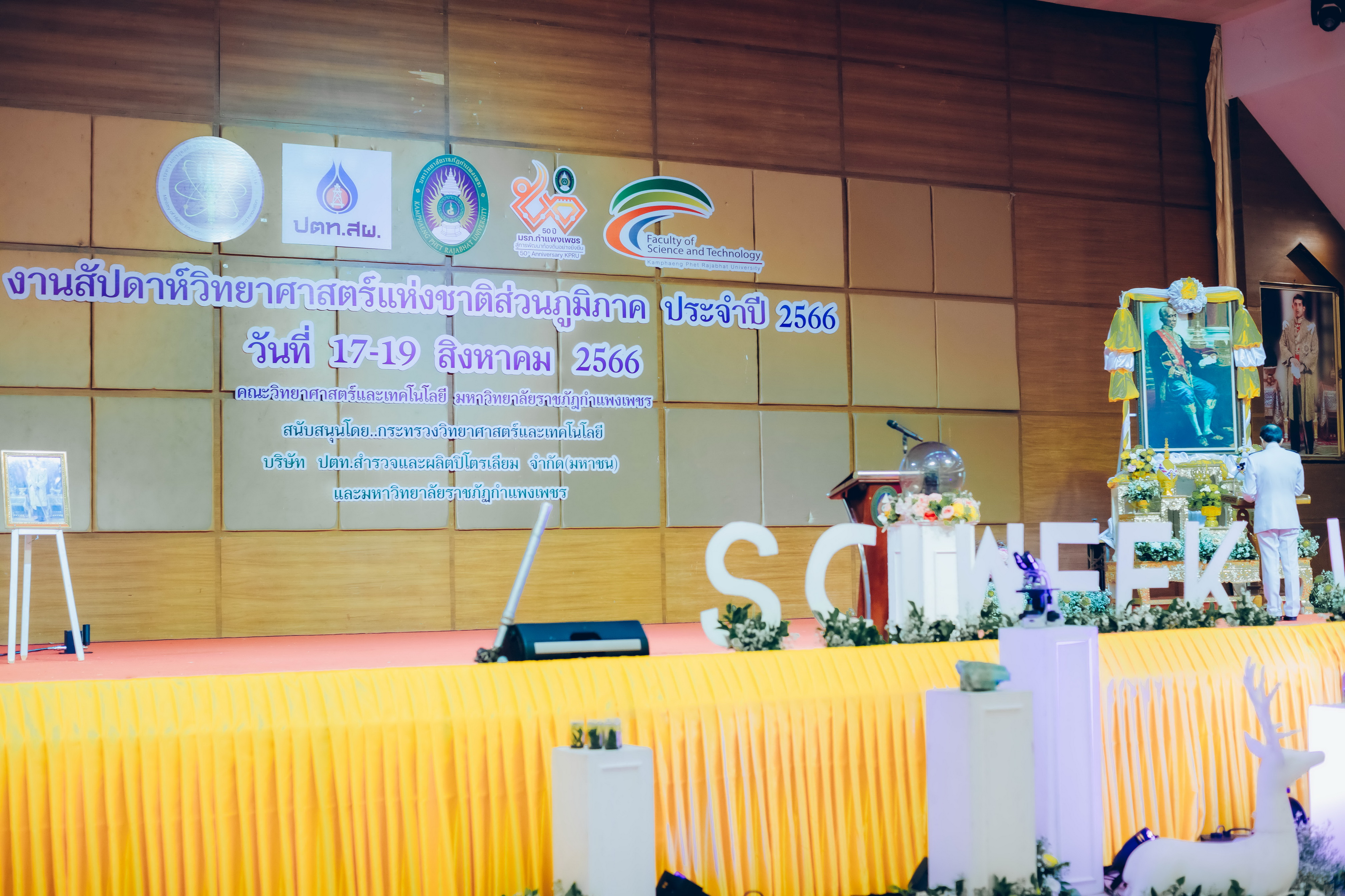 คณะวิทยาศาสตร์และเทคโนโลยี จัดพิธีถวายราชสดุดี พิธีถวายพานพุ่มสักการะและพิธีเปิด งานสัปดาห์วิทยาศาสตร์แห่งชาติ ส่วนภูมิภาค ประจำปี 2566 โดยมีวัตถุประสงค์เพื่อเทิดพระเกียรติ พระปรีชาสามารถด้านวิทยาศาสตร์และเทคโนโลยีของพระบาทสมเด็จพระปรเมนทรรามาธิบดีศรีสินทรมหามงกุฎ พระจอมเกล้าเจ้าอยู่หัว พระสยามเทวมหามกุฏวิทยมหาราช ในฐานะทรงเป็น “พระบิดาแห่งวิทยาศาสตร์ไทย” และเพื่อส่งเสริมการค้นคว้า เผยแพร่ผลงานการค้นคว้าวิจัย ทางวิทยาศาสตร์และเทคโนโลยี เพื่อประโยชน์ในการพัฒนาท้องถิ่นและประเทศชาติ และกระตุ้นให้เยาวชน ประชาชน มีความตื่นตัว เห็นความสำคัญ และให้ความสนใจต่อวิทยาศาสตร์และเทคโนโลยีที่มีต่อการพัฒนาประเทศมากยิ่งขึ้น ในวันศุกร์ที่ 18 สิงหาคม พ.ศ. 2566 เวลา 08.30-10.00 น. ณ ห้องประชุมราชพฤกษ์ ชั้น 3 อาคารทีปังกรรัศมีโชติ มหาวิทยาลัยราชภัฏกำแพงเพชร
