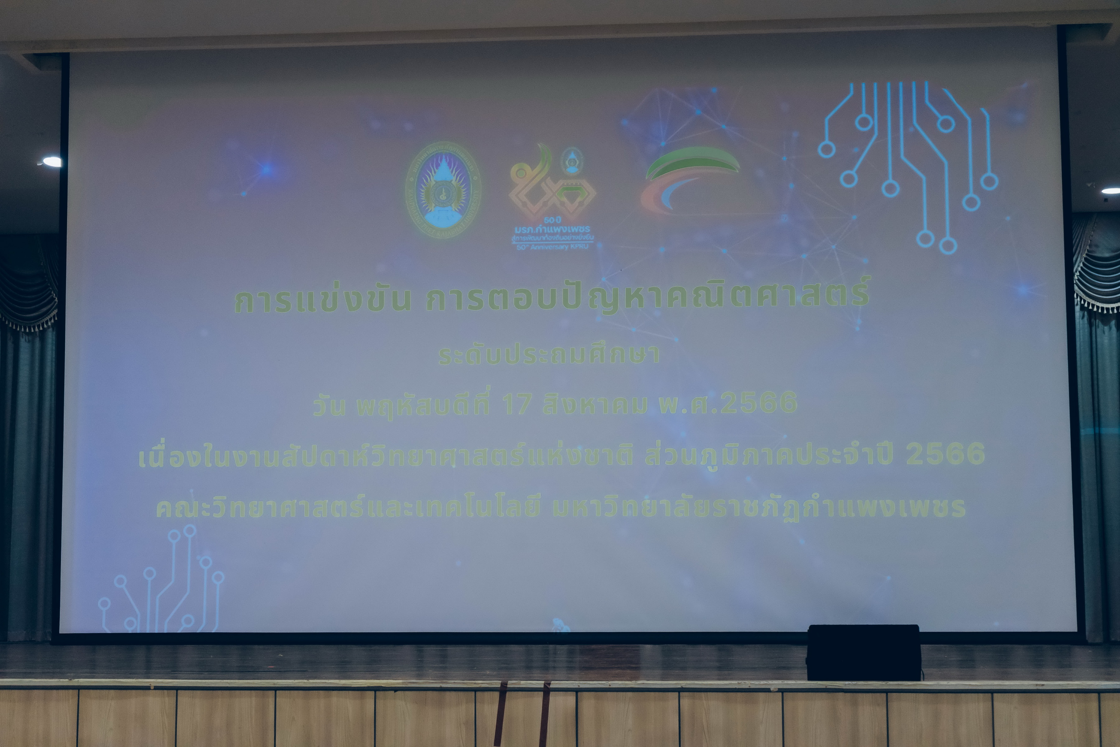 คณะวิทยาศาสตร์และเทคโนโลยี การแข่งขันตอบปัญหาคณิตศาสตร์ ระดับประถมศึกษาตอนปลาย มัธยมศึกษาตอนต้น งานสัปดาห์วิทยาศาสตร์แห่งชาติ ส่วนภูมิภาค ประจำปี 2566 วันที่ 17 สิงหาคม พ.ศ. 2566 เวลา 08.00-16.00 น. ณ หอประชุมรัตนอาภา มหาวิทยาลัยราชภัฏกำแพงเพชร