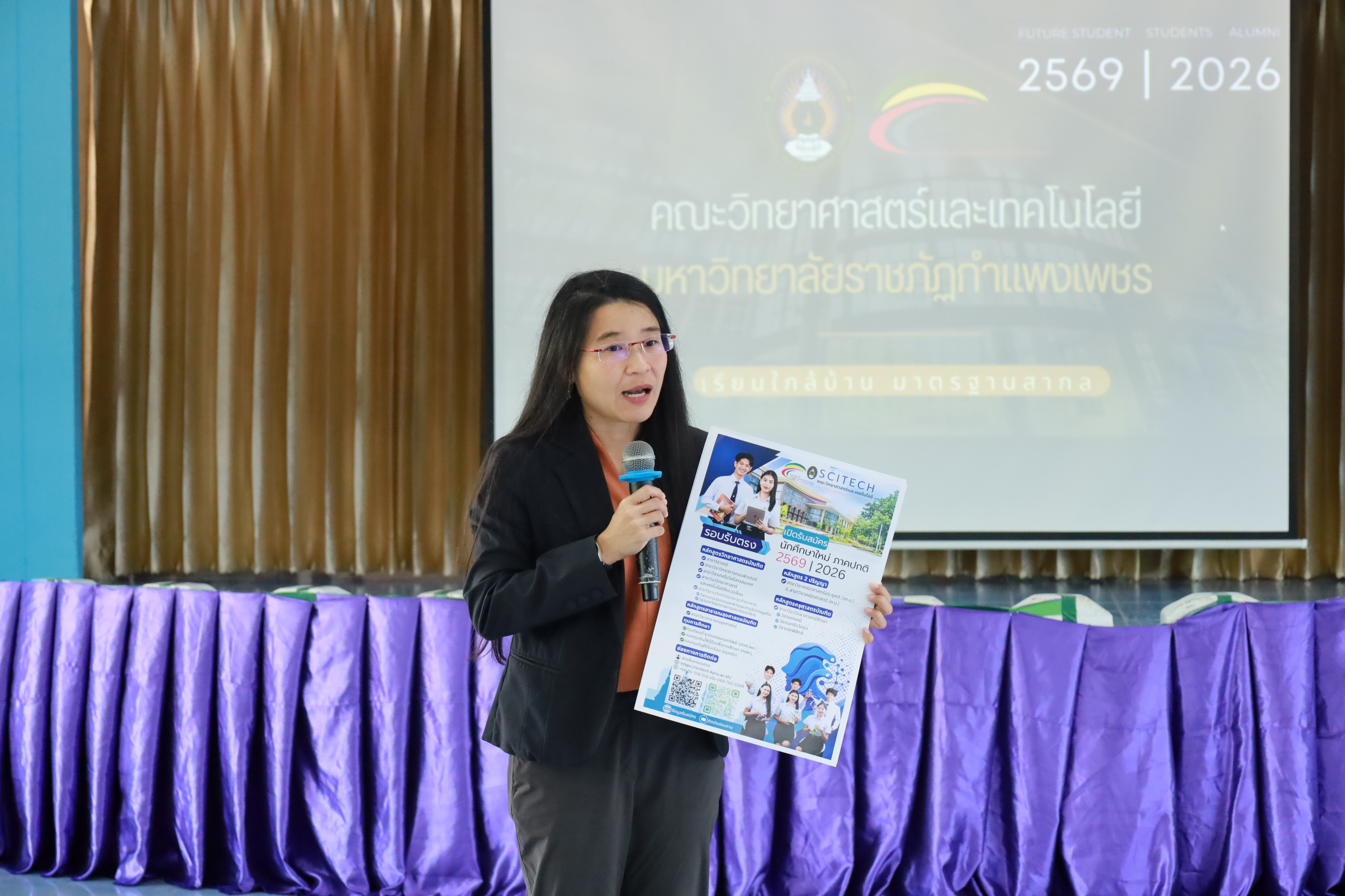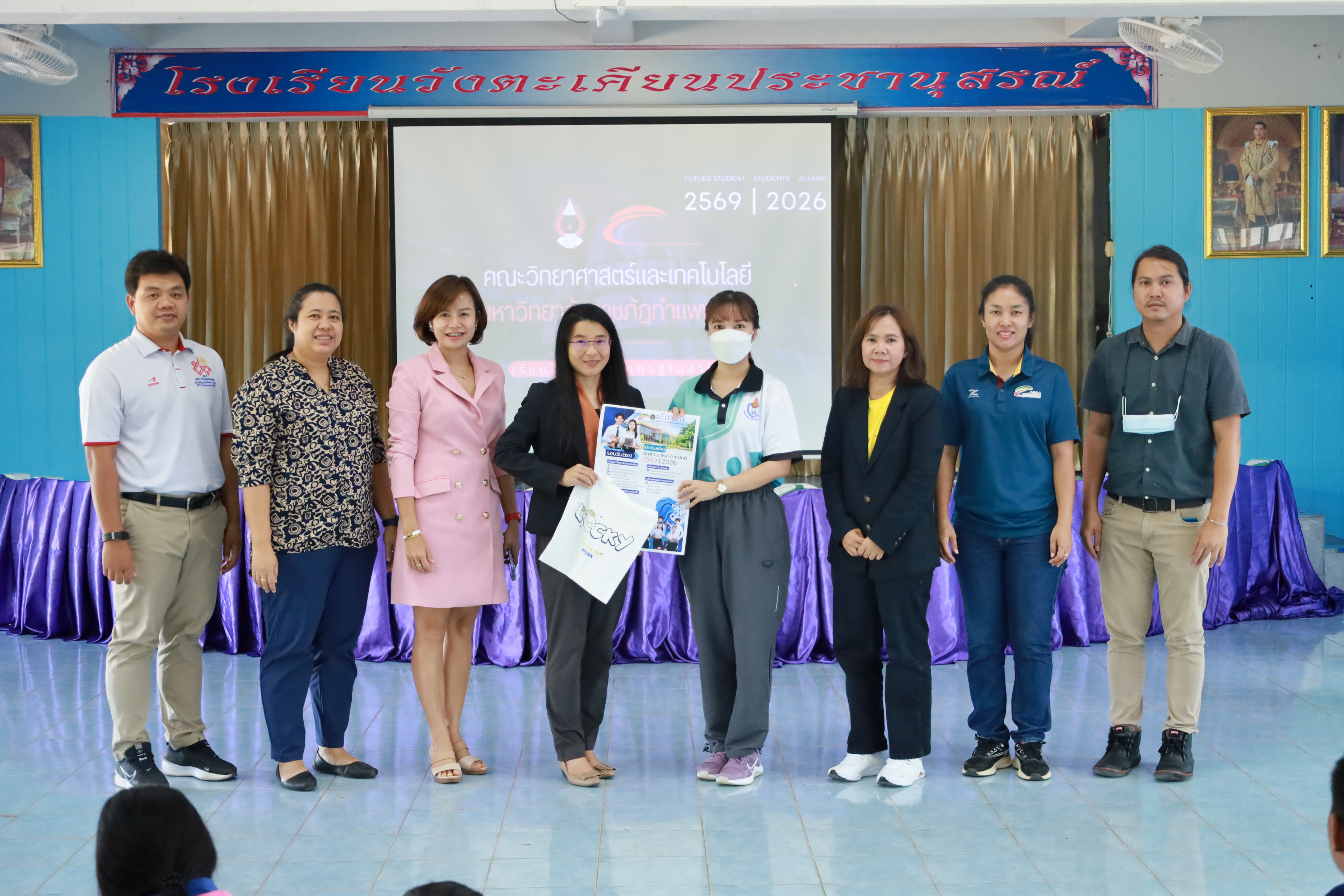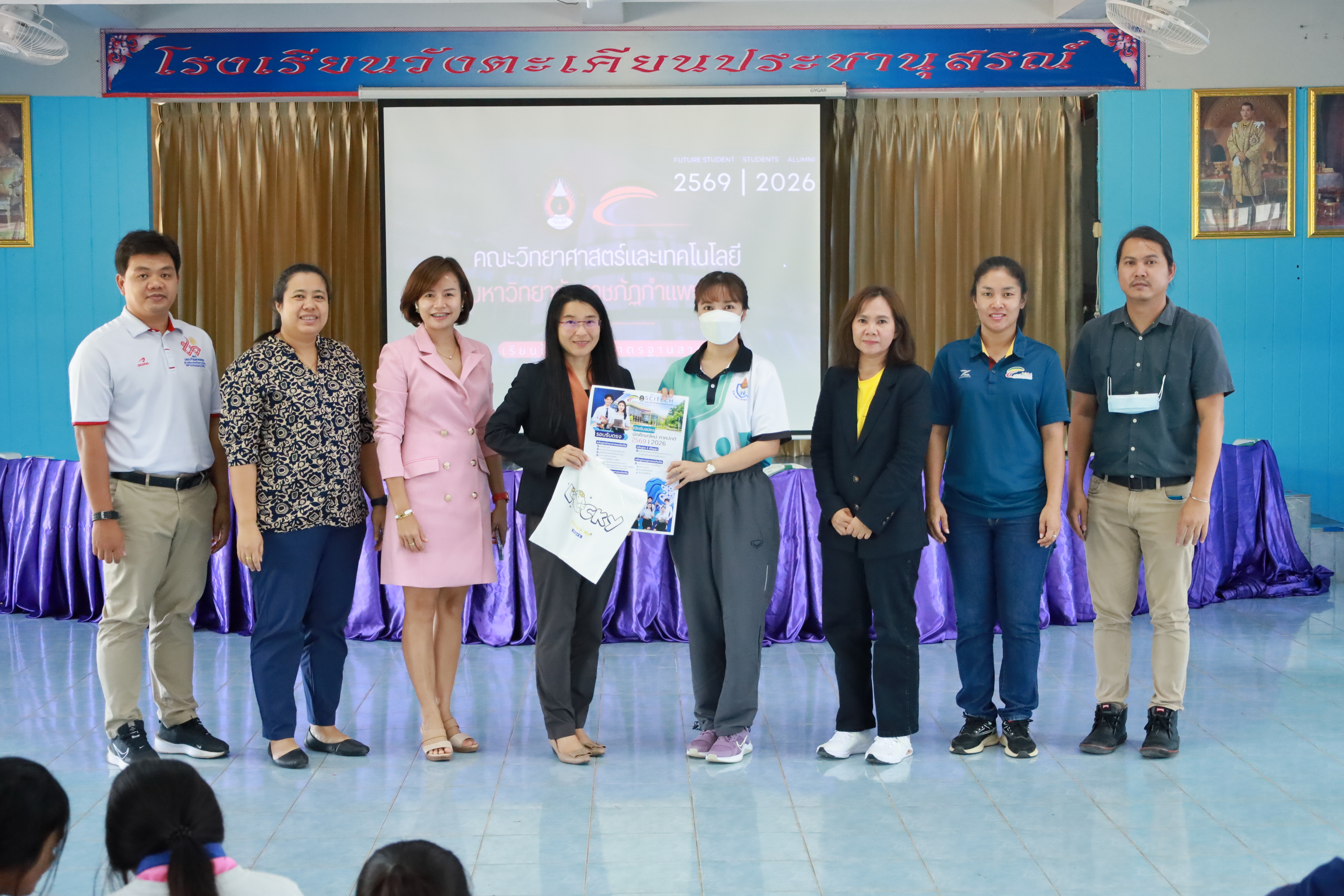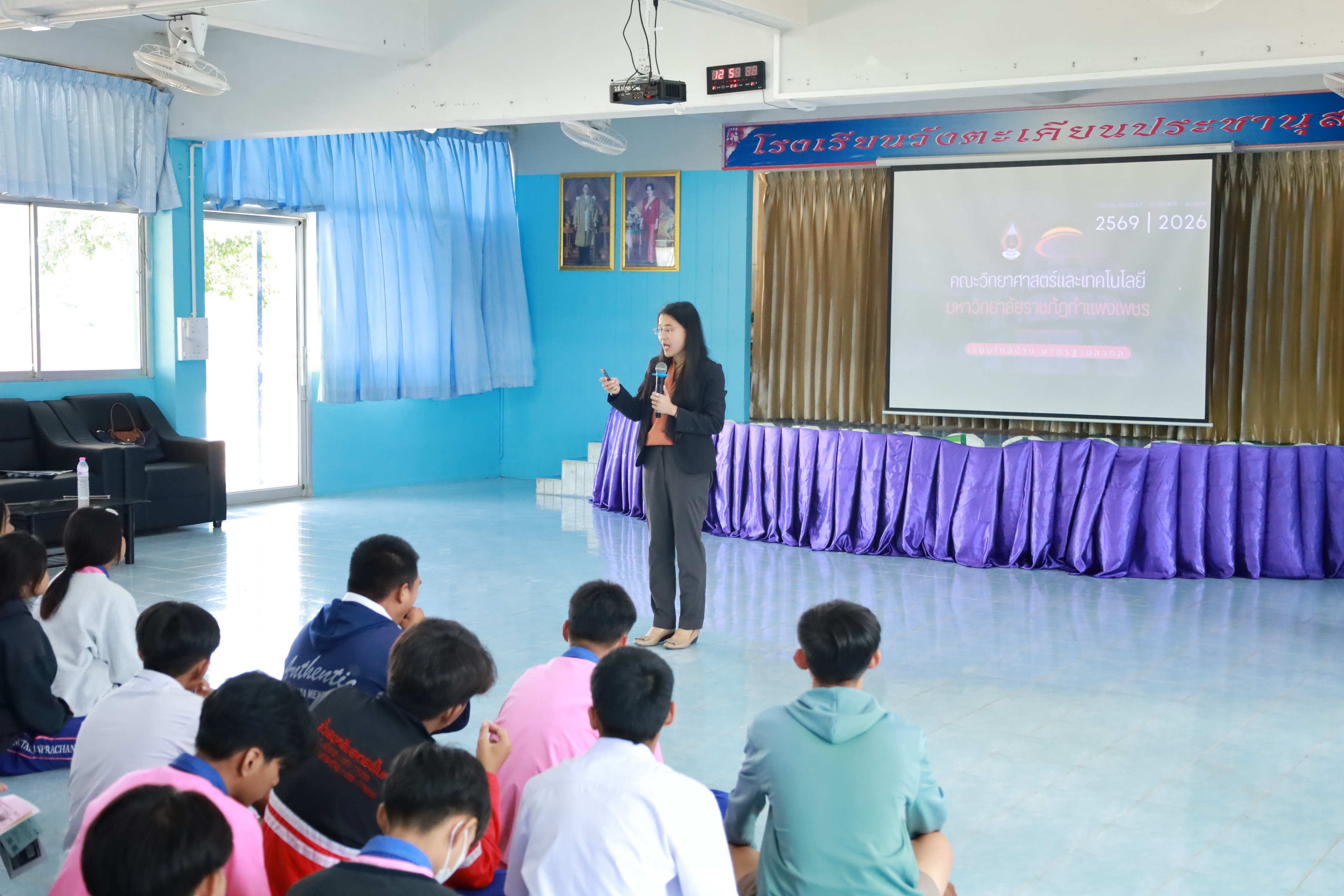 คณะวิทยาศาสตร์และเทคโนโลยี มหาวิทยาลัยราชภัฏกําแพงเพชร จัดโครงการประชาสัมพันธ์รายวิชาและหลักสูตรไปยังผู้เรียนกลุ่มใหม่ (Non-age Group) สำหรับโรงเรียนมัธยมศึกษาในเขตพื้นที่การศึกษาจังหวัดกำแพงเพชรที่เข้าร่วมเครือข่ายลงนามความร่วมมือ ให้กับนักเรียนระดับชั้นมัธยมศึกษาปีที่ 6 โรงเรียนวังตะเคียนประชานุสรณ์ จำนวน 55 คน เพื่อให้นักเรียนได้รับข้อมูลที่ถูกต้อง ชัดเจน และทันสมัยเกี่ยวกับการศึกษาต่อรวมถึงได้มีโอกาสแลกเปลี่ยนประสบการณ์กับผู้ที่เคยผ่านการศึกษานั้นมาก่อนซึ่งจะเป็นประโยชน์ ในการวางแผนอนาคตและตัดสินใจเลือกแนวทางที่เหมาะสมกับตนเองต่อๆ ไป "ในวันที่ 25 มิถุนายน 2568 " เวลา 13.00-14.00 น. ณ โรงเรียนวังตะเคียนประชานุสรณ์
