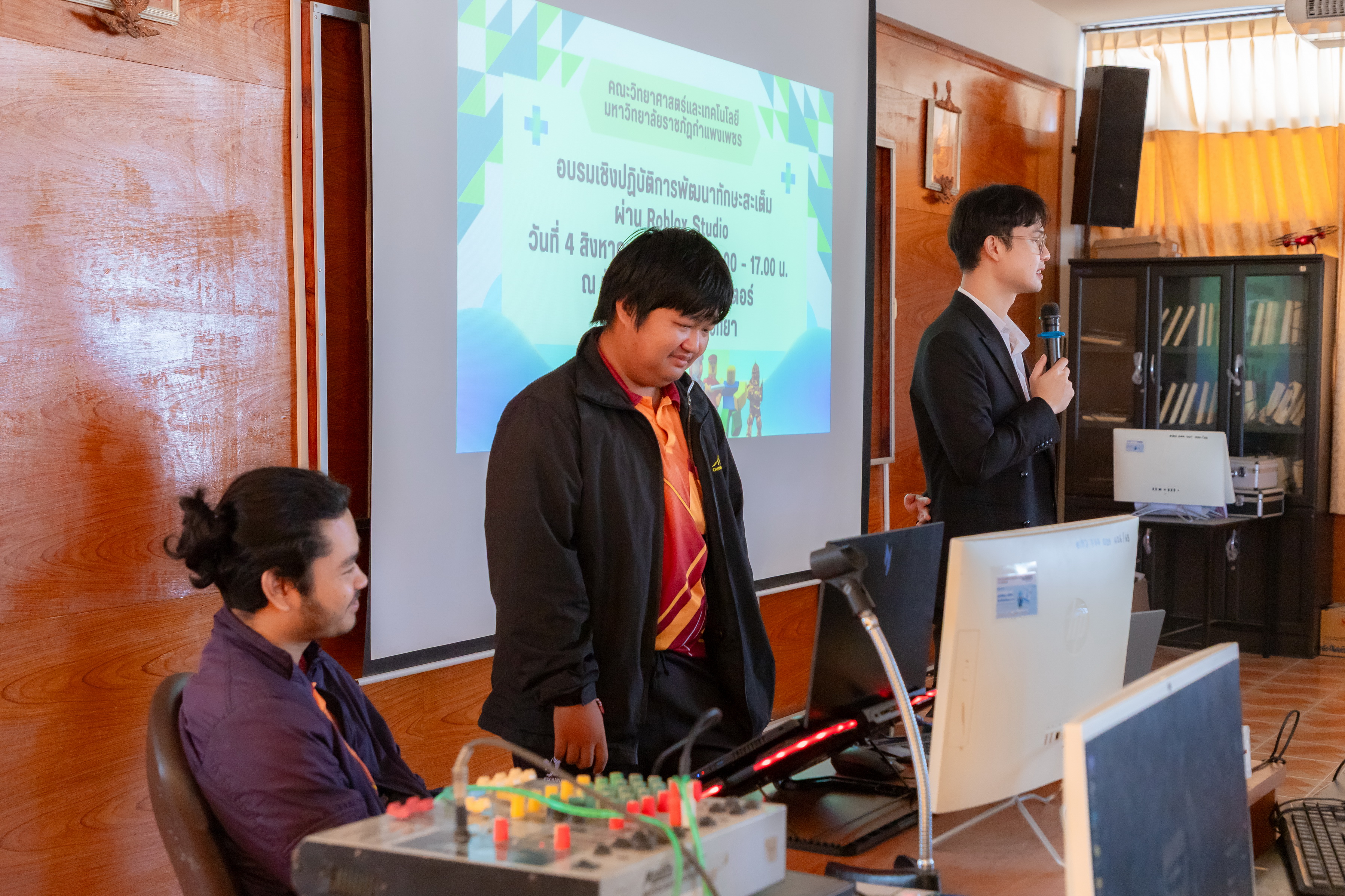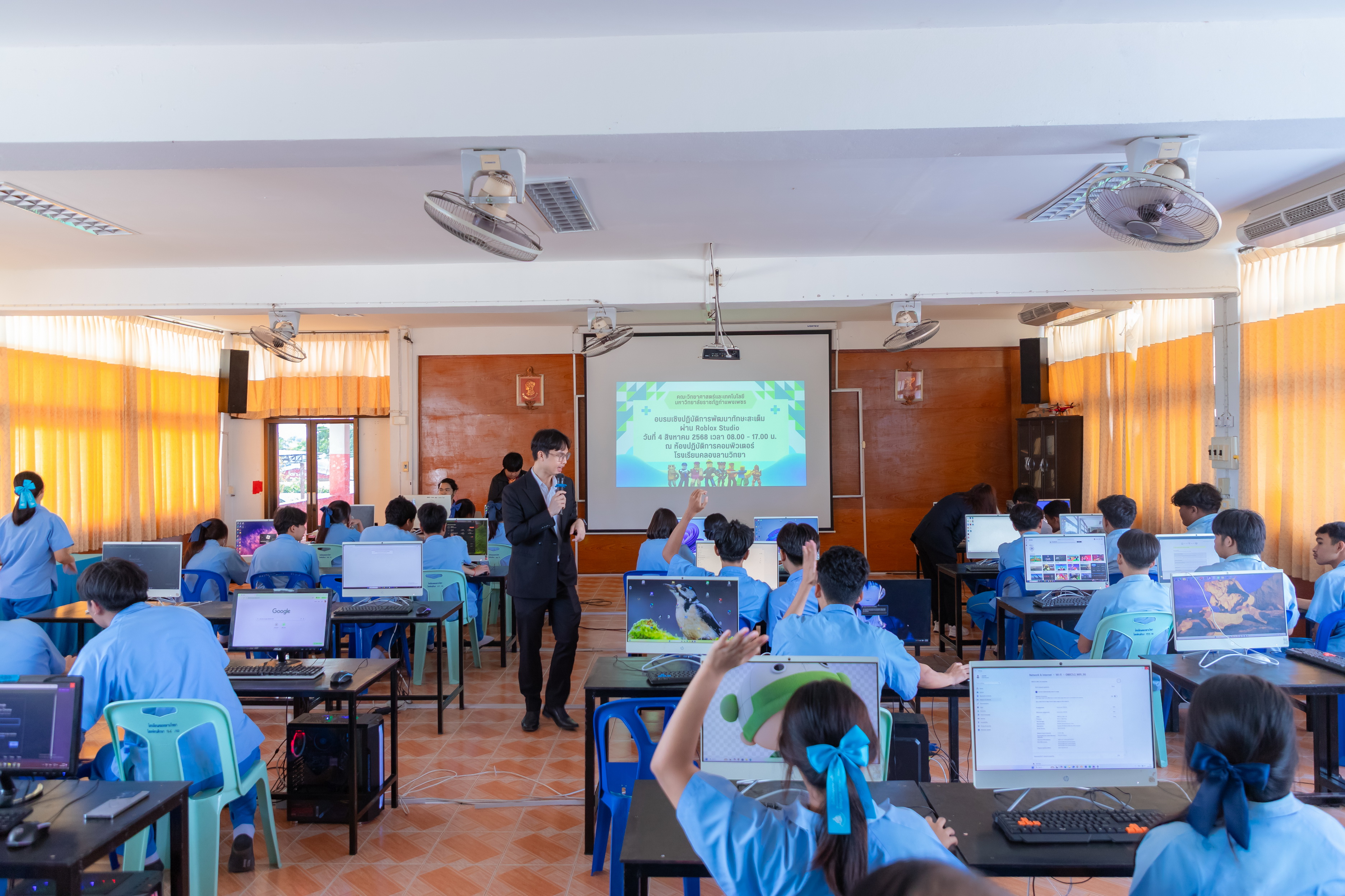 คณะวิทยาศาสตร์และเทคโนโลยี มหาวิทยาลัยราชภัฏกําแพงเพชร จัดกิจกรรมอบรมเชิงปฏิบัติการ เรื่อง การพัฒนาทักษะสะเต็ม ผ่าน Roblox ตามโครงการการพัฒนานวัตกรรมด้านสะเต็ม คณะวิทยาศาสตร์และเทคโนโลยี ให้กับนักเรียนโรงเรียนคลองลานวิทยา ระดับชั้นมัธยมศึกษาปีที่ 6 จำนวน 40 คน โดยมีวัตถุประสงค์เพื่อพัฒนางานวิจัยและนวัตกรรมให้สามารถนาไปใช้ในการพัฒนาชุมชนเป้าหมายของคณะวิทยาศาสตร์และเทคโนโลยีและสนับสนุนการตีพิมพ์เผยแพร่งานวิจัยและนวัตกรรม วันจันทร์ที่ 4 สิงหาคม พ.ศ. 2568 เวลา 08.00-17.00 น. ห้องปฏิบัติการคอมพิวเตอร์ 1 (3201) โรงเรียนคลองลานวิทยา ตำบลคลองน้ำไหล อำเภอคลองลาน จังหวัดกำแพงเพชร