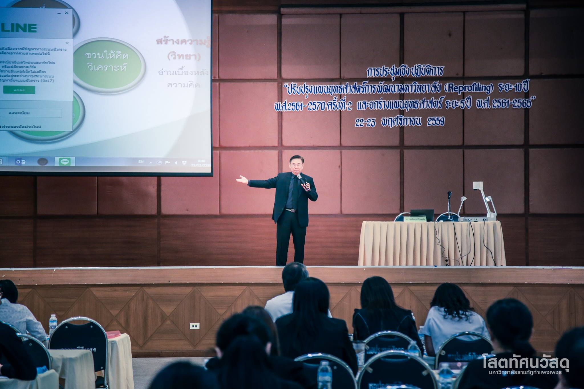 คณะวิทยาศาสตร์และเทคโนโลยีเข้าร่วม โครงการประชุมเชิงปฏิบัติการ “ปรับปรุงแผนยุทธศาสตร์การพัฒนามหาวิทยาลัย (Reprofiling) ระยะ 10 ปี พ.ศ. 2561 – 2570 ครั้งที่ 2 และยกร่างแผนยุทธศาสตร์ ระยะ 5 ปี พ.ศ. 2561 -2565” จัดโดย มหาวิทยาลัยราชภัฏกำแพงเพชร ระหว่างวันที่ 22 – 23 พฤศจิกายน 2559 เวลา 08.30 น. – 16.30 น. เพื่อให้เกิดการมีส่วนร่วมในการแสดงความคิดเห็นจากผู้บริหาร คณาจารย์ และบุคลากร สามารถนำข้อมูลมาประกอบการจัดทำแผนยุทธศาสตร์การพัฒนามหาวิทยาลัย โดยมีวิทยากรผู้เชี่ยวชาญ อาจารย์ธนิตสรณ์ จิระพรชัย รองอธิการบดีฝ่ายแผนและสารสนเทศมหาวิทยาลัยเทคโนโลยีพระจอมเกล้าธนบุรี มาบรรยาย ณ ห้องราชพฤกษ์ ชั้น 3 อาคารทีปังกรรัศมีโชติ