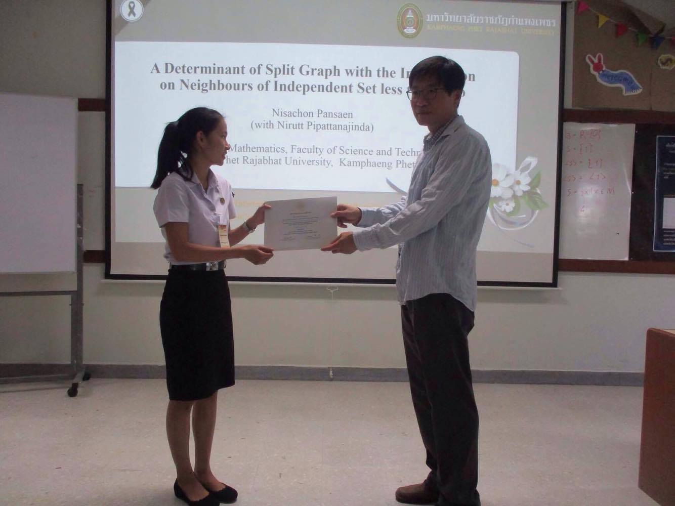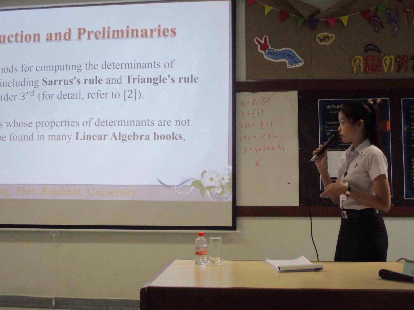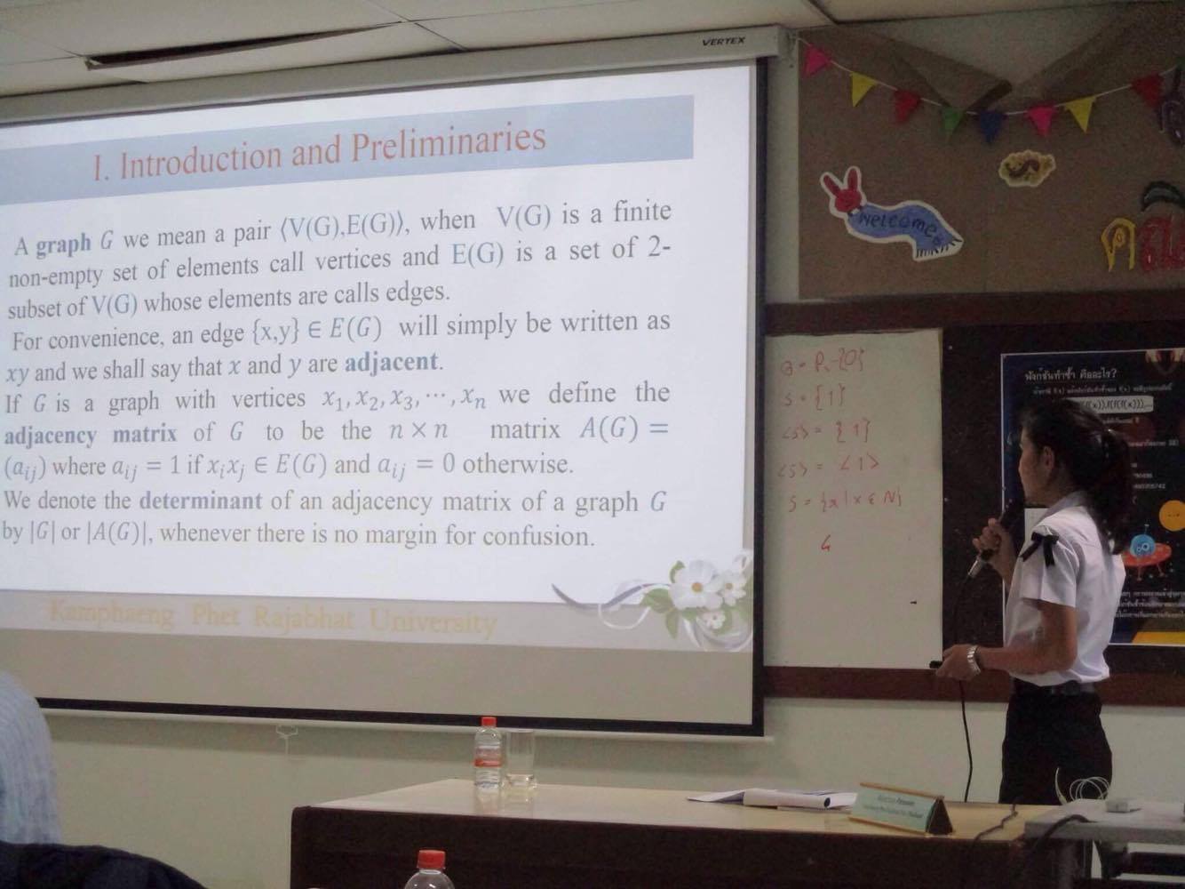 ผู้ช่วยศาสตราจารย์ ดร.นิรุตติ์ พิพรรธนจินดา นางสาวนิศาชล ปันแสน นางสาวสมพร สิทธิแพทย์ นางสาวพิมพ์ผกา กำเนิดมี อาจารย์และนักศึกษาโปรแกรมวิชาคณิตศาสตร์ คณะวิทยาศาสตร์และเทคโนโลยี เข้าร่วมโครงการประชุมวิชาการนานาชาติ International KMITL Mathematical Science Conference ณ ภาควิชาคณิตศาสตร์ คณะวิทยาศาสตร์ สถาบันเทคโนโลยีพระจอมเกล้าเจ้าคุณทหารลาดกระบัง เพื่อนำเสนอผลงานแบบบรรยายและตีพิมพ์บทความเผยแพร่ เมื่อวันที่ 22-25 ธันวาคม 2559