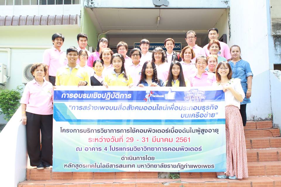 โปรแกรมวิชาวิทยาการคอมพิวเตอร์ จัดการอบรมเชิงปฏิบัติการการสร้างเพจบนสื่อสังคมออนไลน์เพื่อประกอบธุรกิจบนเครือข่าย ในวันที่ 29-31 มีนาคม 2561 เวลา 09.00-16.00 น. ณ อาคารเรียน 4 ห้อง 4102 โปรแกรมวิชาวิทยาการคอมพิวเตอร์ โดย ผศ.พรหมเมศ วีระพันธ์ ให้กับ ผู้สูงอายุและประชาชนทั่วไป วิทยากรโดย ผศ.พรหมเมศ วีระพันธ์,คุณนิสารัตน์ เหลี่ยวเจริญวัฒน์