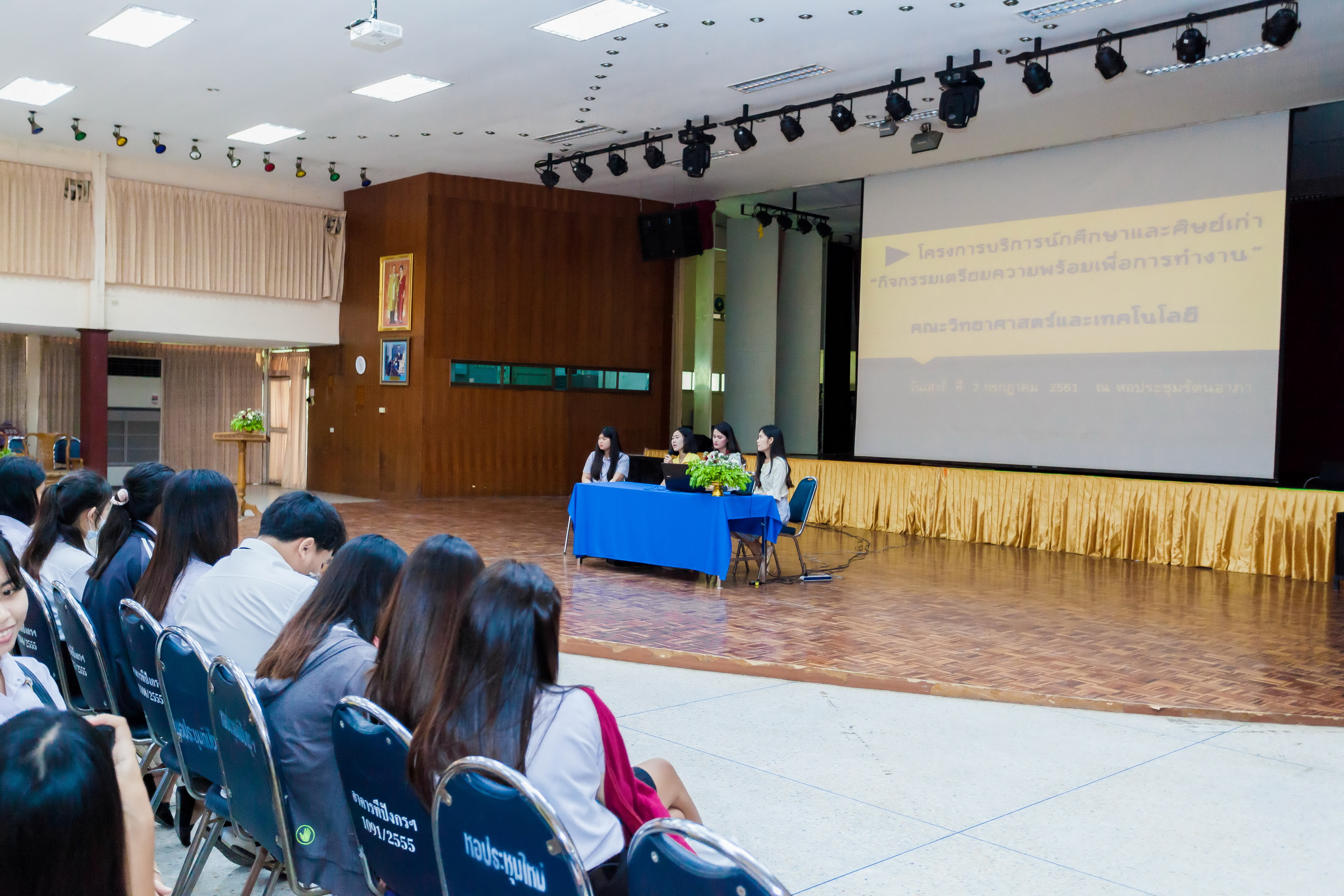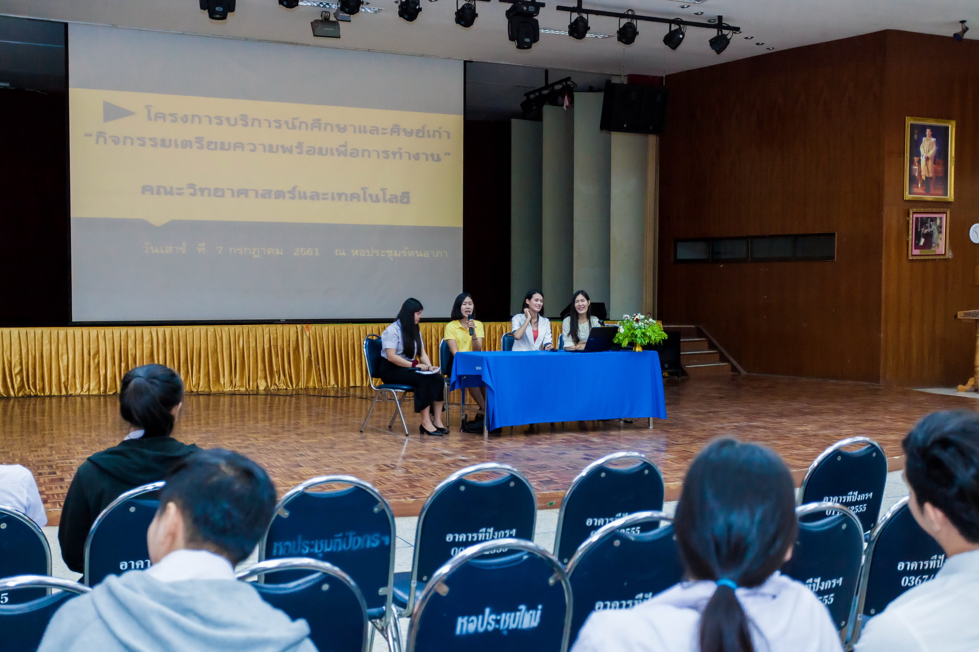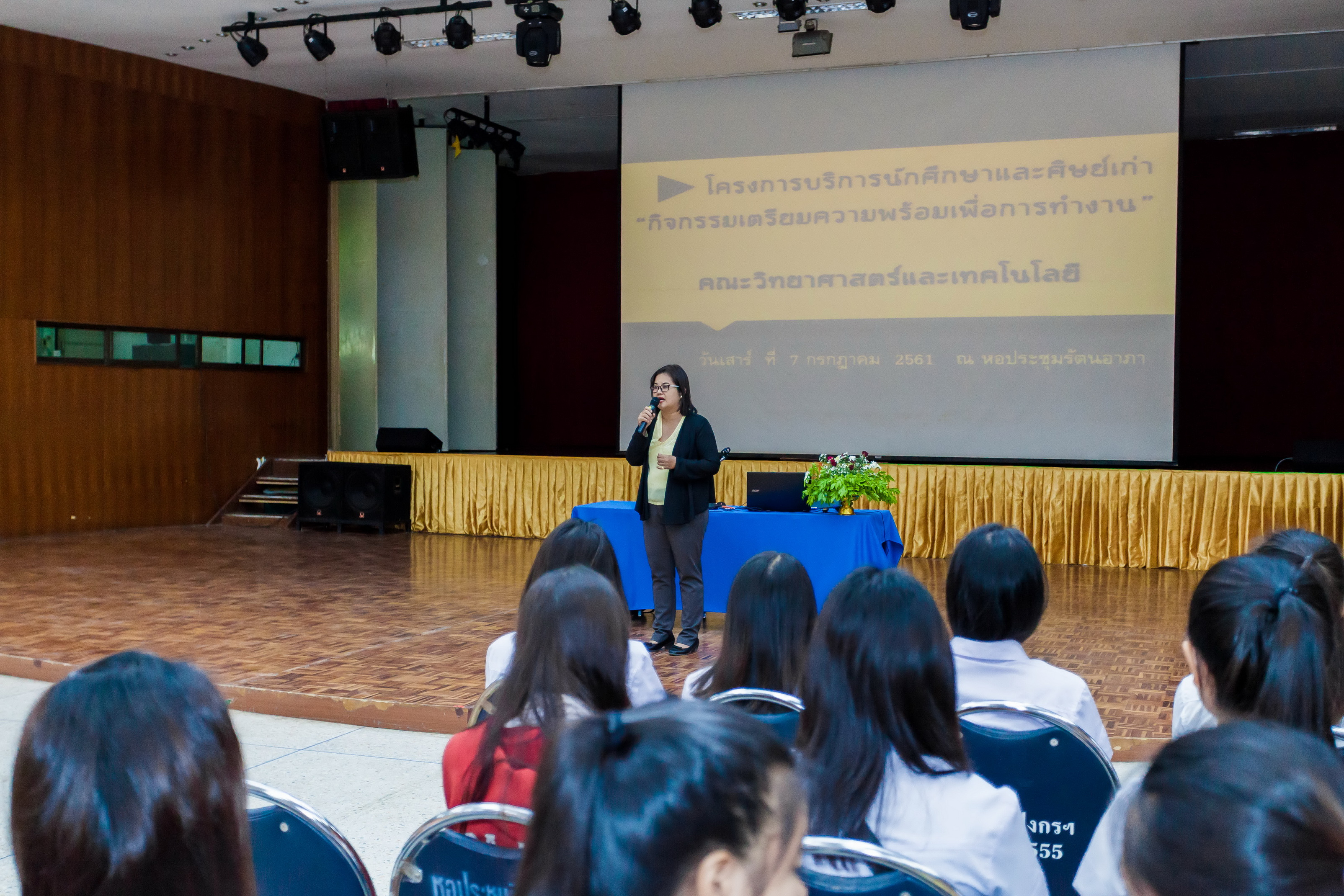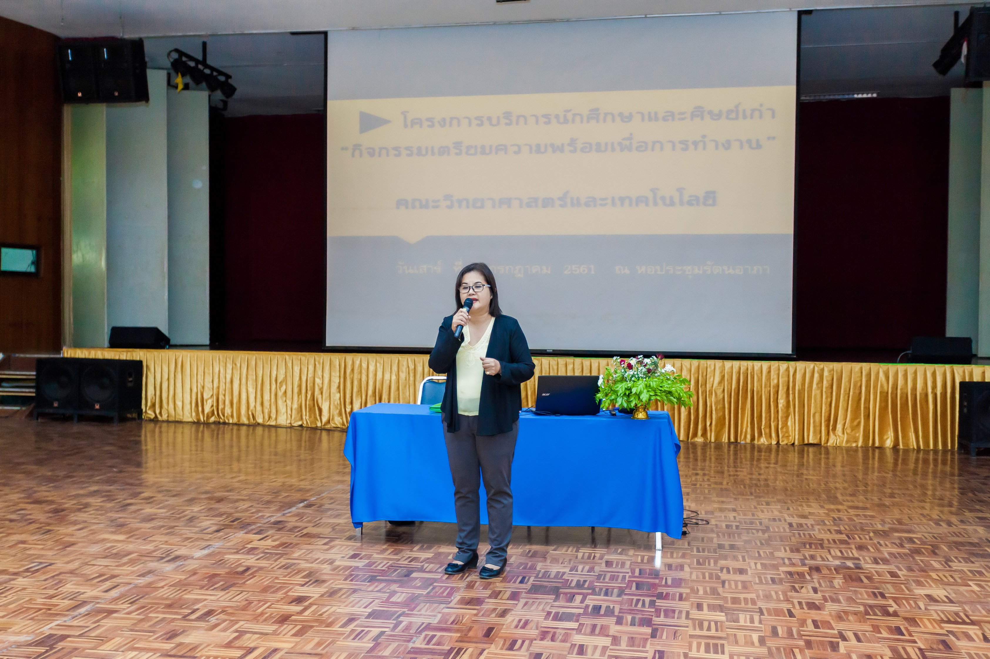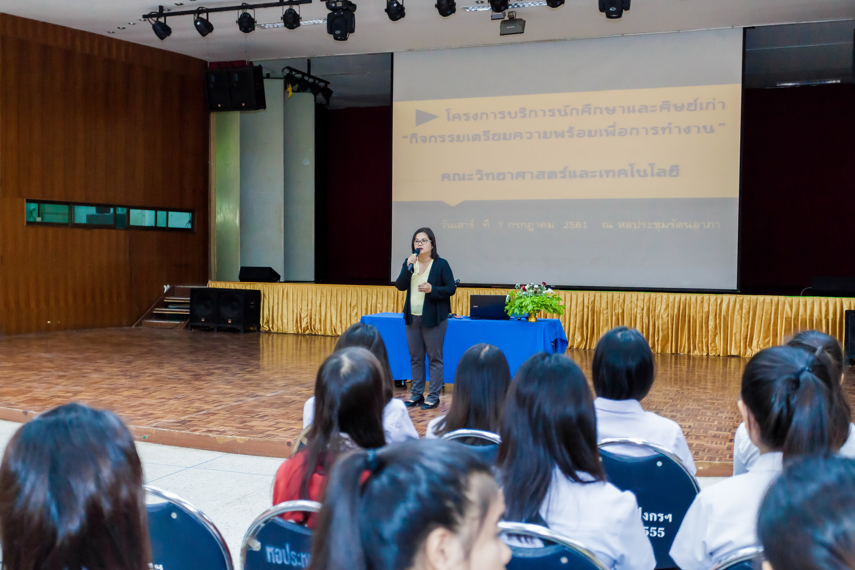 สโมสรนักศึกษาคณะวิทยาศาสตร์และเทคโนโลยี จัดโครงการบริการนักศึกษาและศิษย์เก่า “กิจกรรมเตรียมความพร้อมเพื่อการทำงาน” ในวันที่ วันเสาร์ ที่ 7 กรกฎาคม 2561 เวลา 08.30-17.30 น. ณ หอประชุมรัตนอาภา โดย สโมสรนักศึกษาคณะวิทยาศาสตร์และเทคโนโลยี ให้กับ นักศึกษาคณะวิทยาศาสตร์และเทคโนโลยีชั้นปีที่ 4 วิทยากรโดย คุณพิชชาภัชร์ จริยาจินดาเสถียร ตำแหน่ง นักวิชาการแรงงานชำนาญการ สำนักงานจัดหางานจังหวัดกำแพงเพชร และศิษบ์เก่าคณะวิทยาศาสตร์และเทคโนโลยี