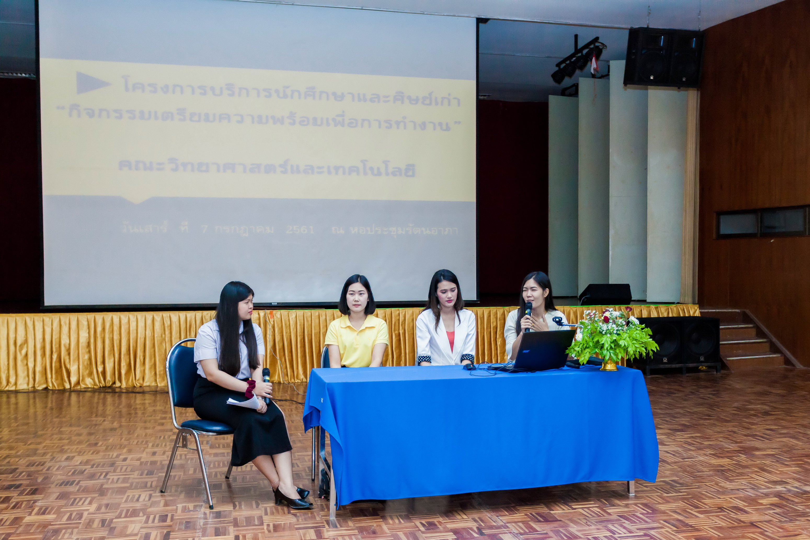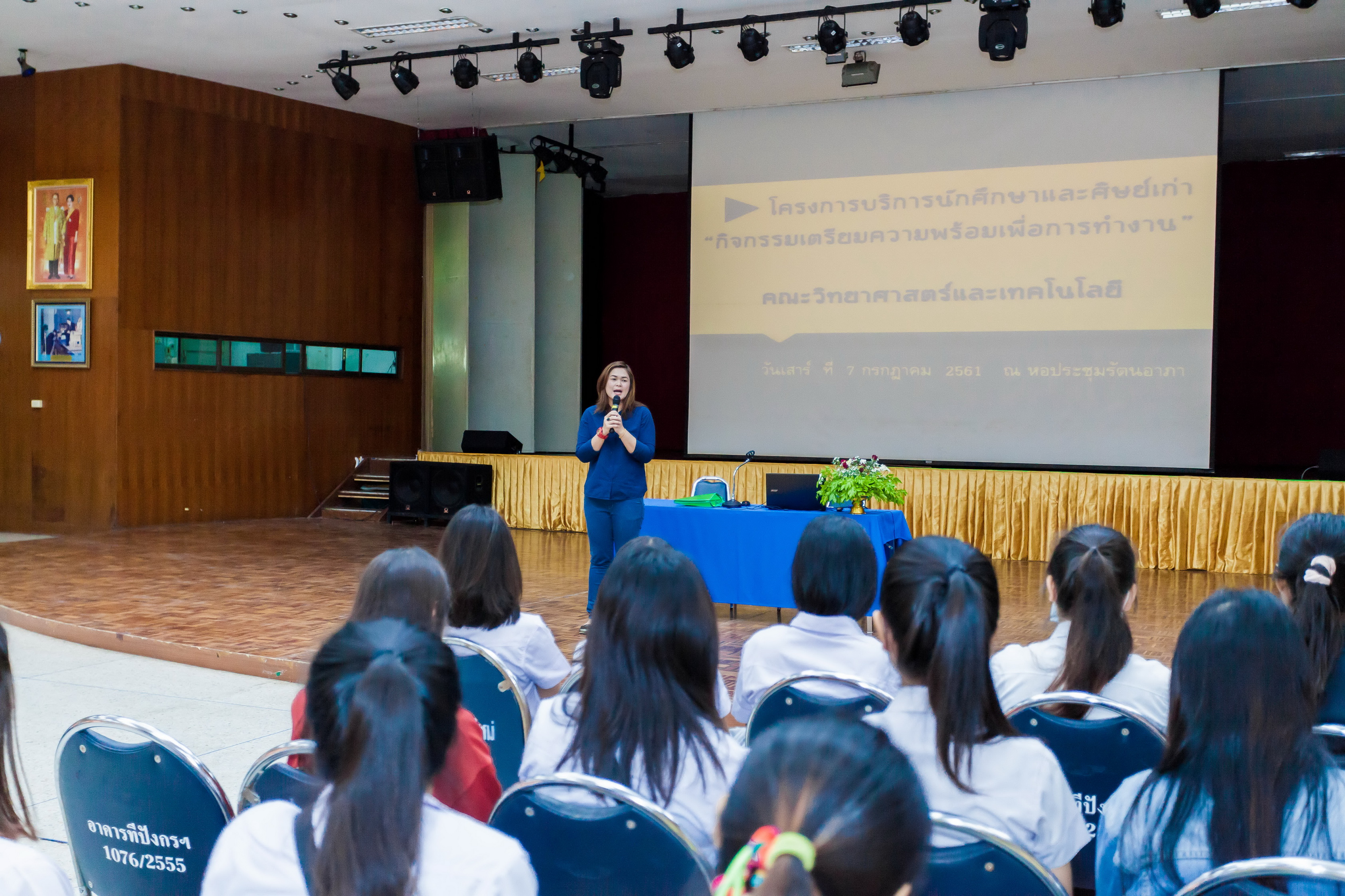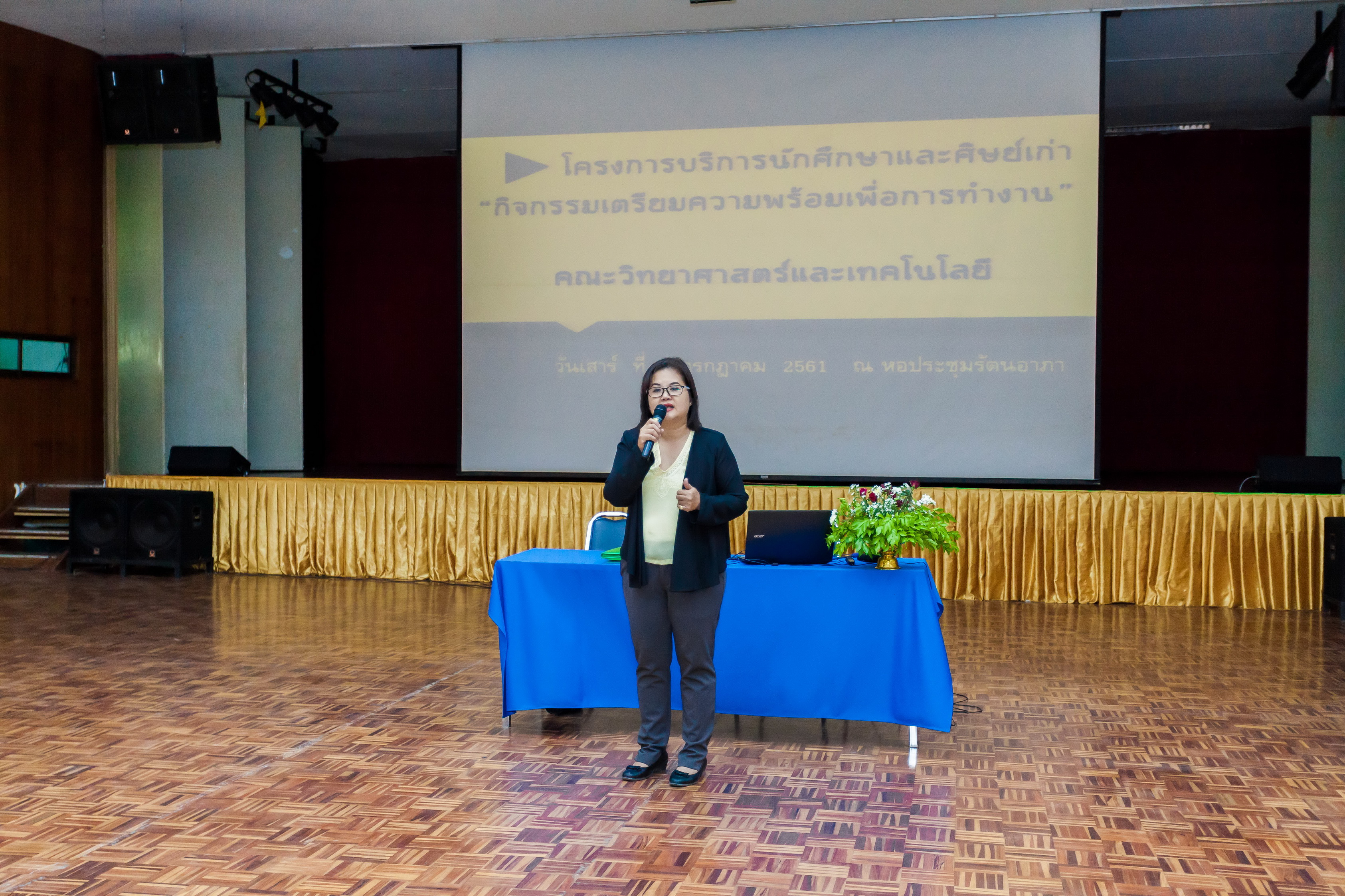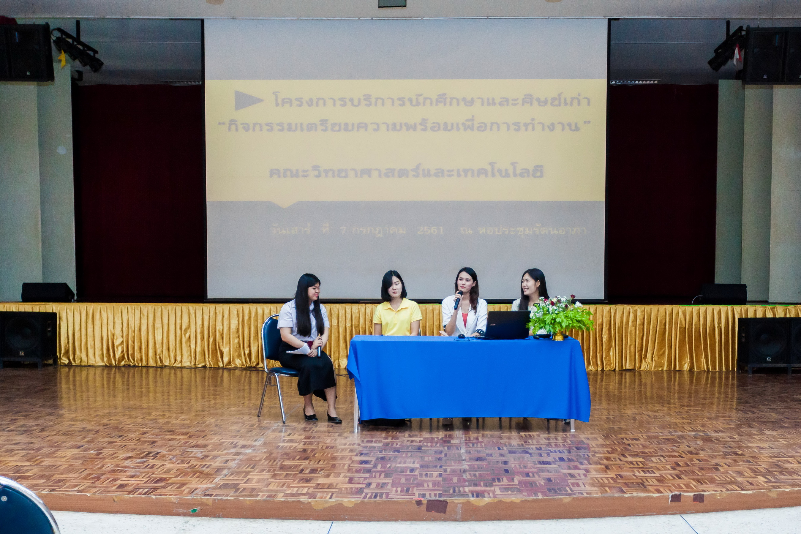 สโมสรนักศึกษาคณะวิทยาศาสตร์และเทคโนโลยี จัดโครงการบริการนักศึกษาและศิษย์เก่า “กิจกรรมเตรียมความพร้อมเพื่อการทำงาน” ในวันที่ วันเสาร์ ที่ 7 กรกฎาคม 2561 เวลา 08.30-17.30 น. ณ หอประชุมรัตนอาภา โดย สโมสรนักศึกษาคณะวิทยาศาสตร์และเทคโนโลยี ให้กับ นักศึกษาคณะวิทยาศาสตร์และเทคโนโลยีชั้นปีที่ 4 วิทยากรโดย คุณพิชชาภัชร์ จริยาจินดาเสถียร ตำแหน่ง นักวิชาการแรงงานชำนาญการ สำนักงานจัดหางานจังหวัดกำแพงเพชร และศิษบ์เก่าคณะวิทยาศาสตร์และเทคโนโลยี