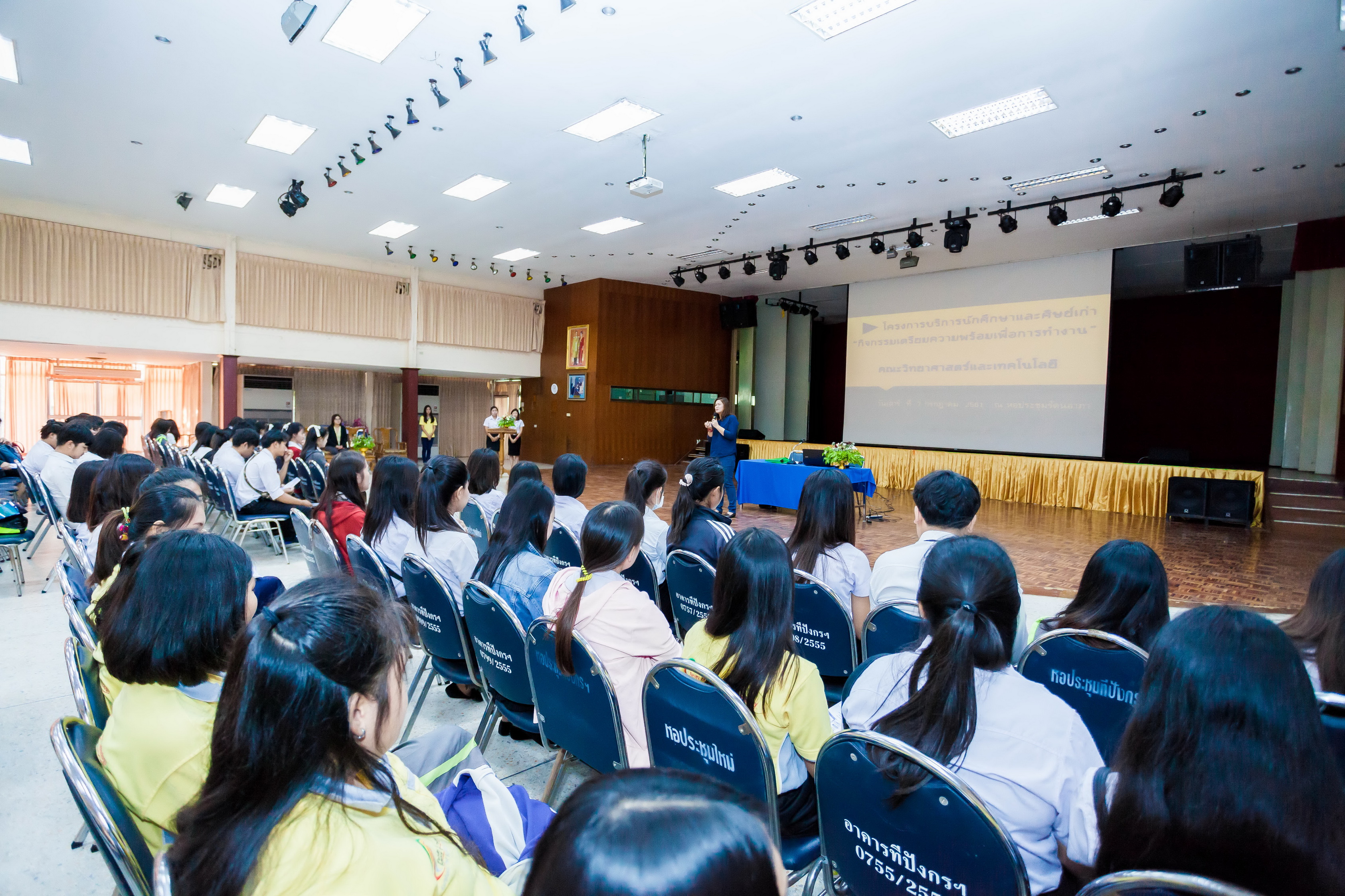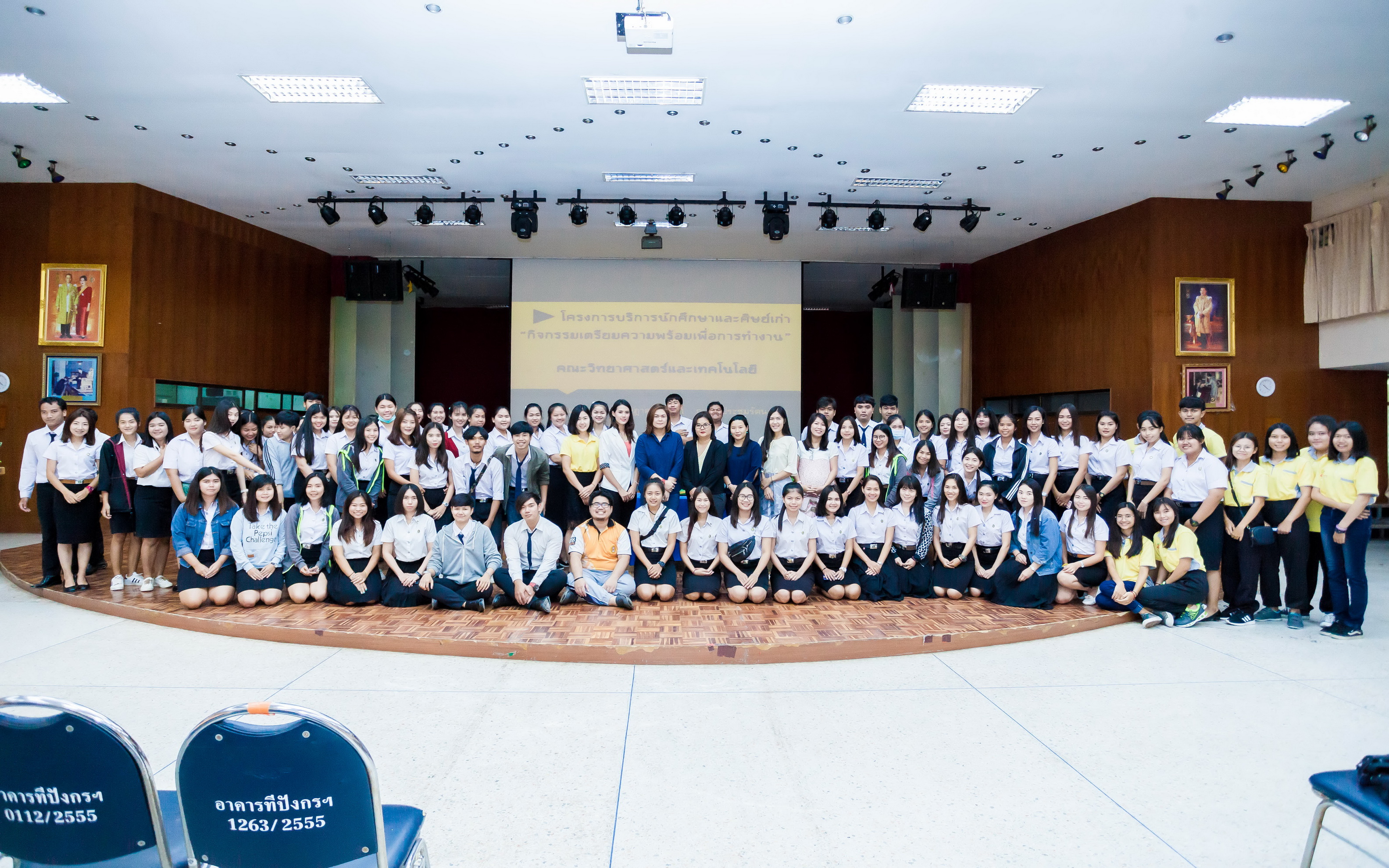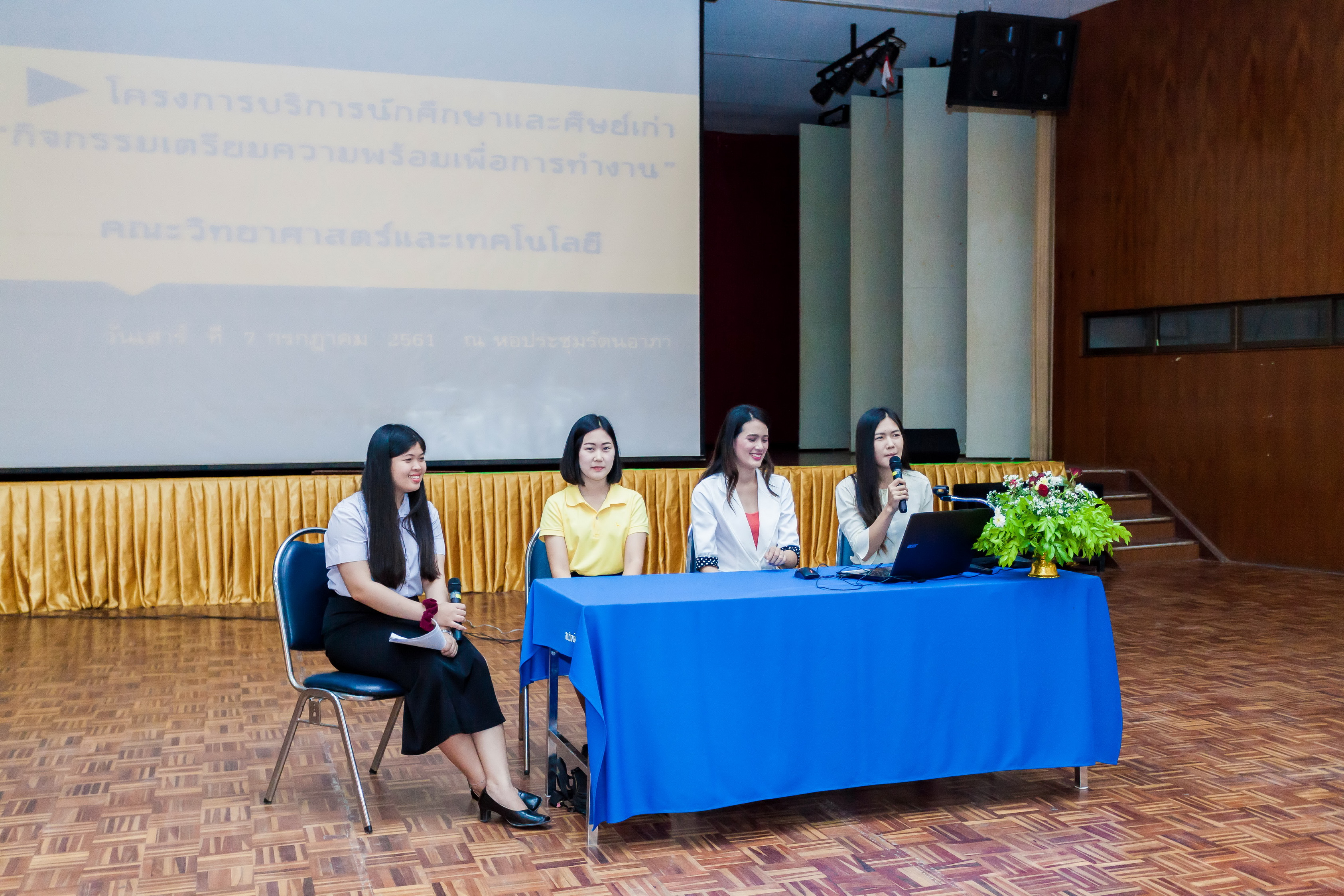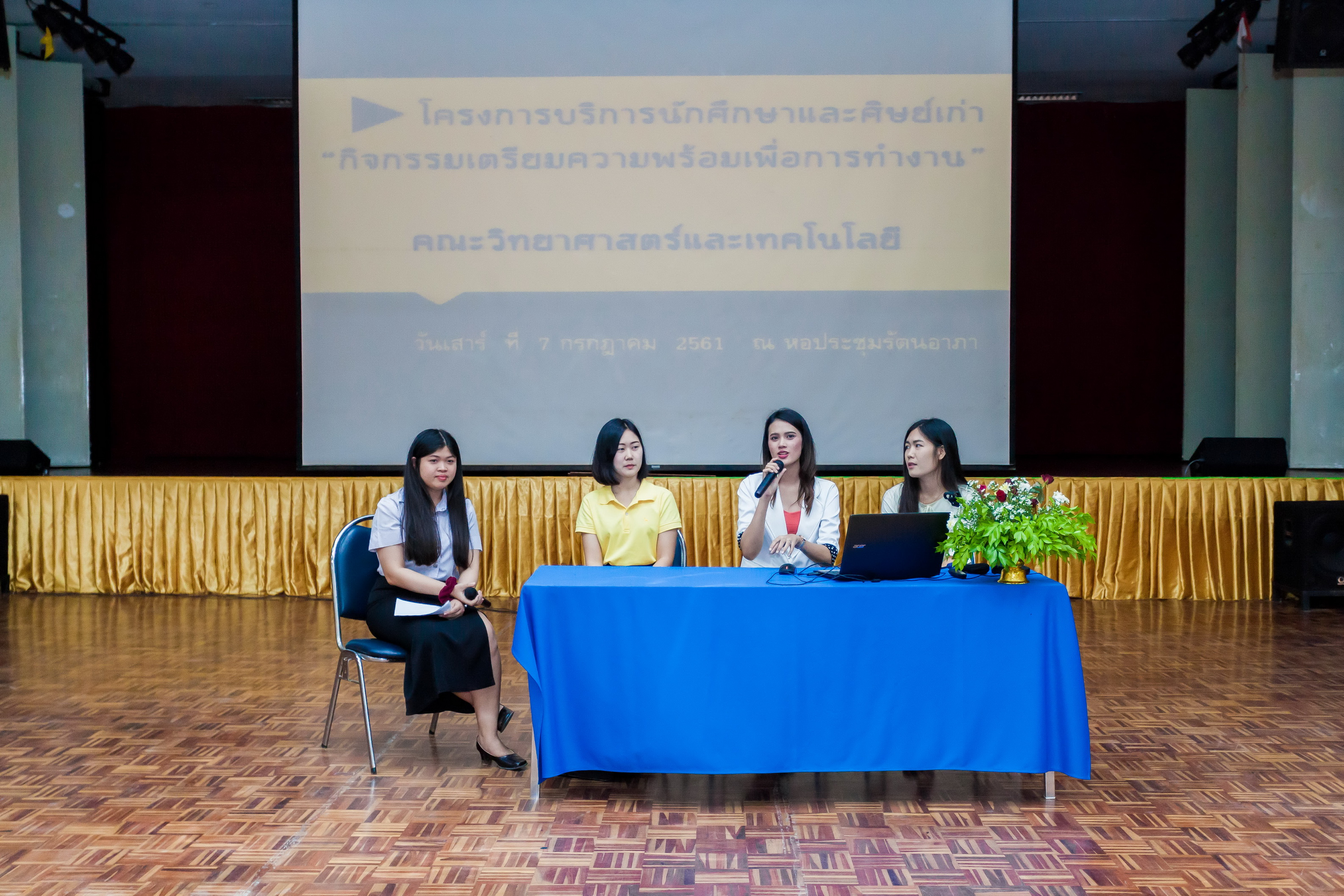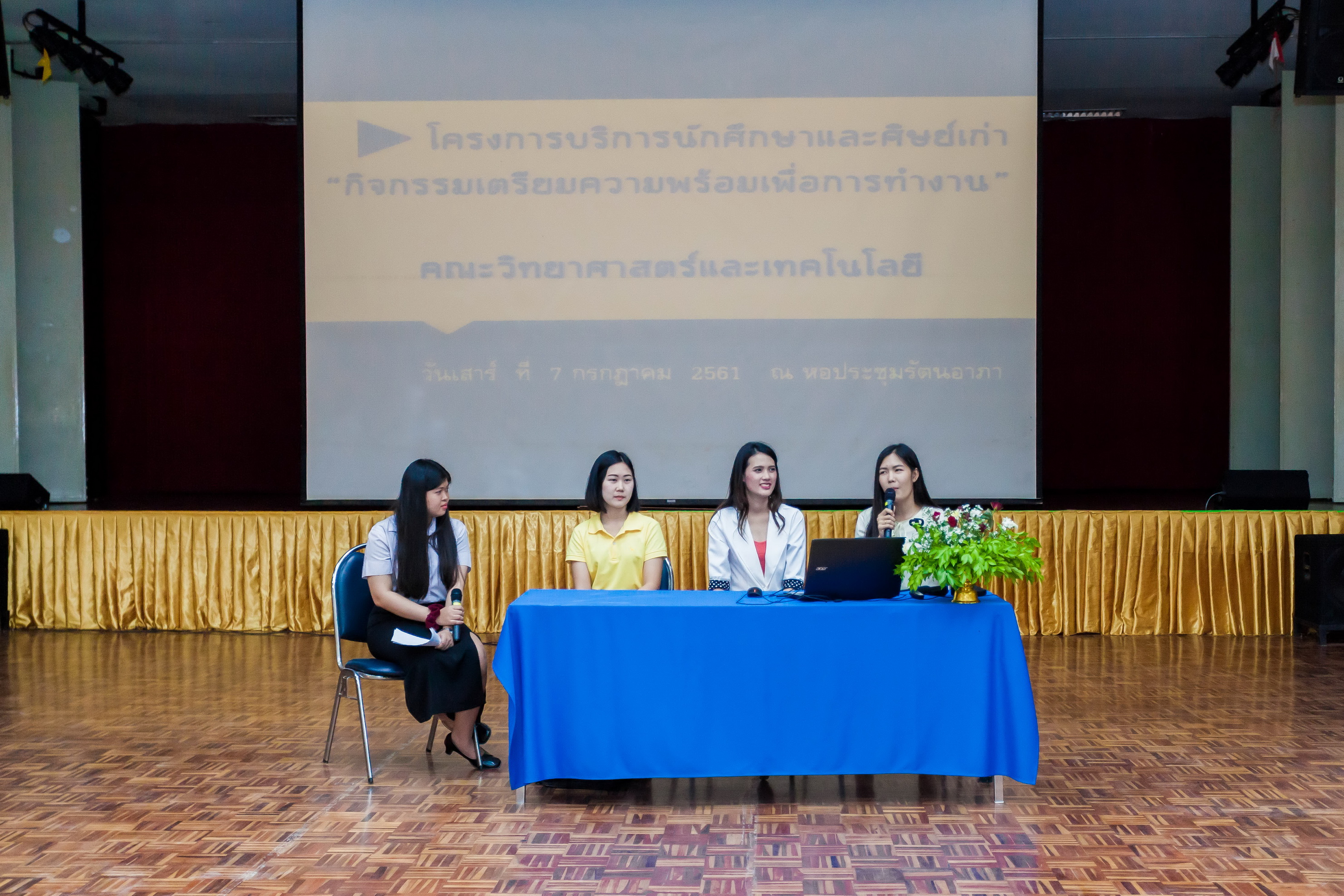 สโมสรนักศึกษาคณะวิทยาศาสตร์และเทคโนโลยี จัดโครงการบริการนักศึกษาและศิษย์เก่า “กิจกรรมเตรียมความพร้อมเพื่อการทำงาน” ในวันที่ วันเสาร์ ที่ 7 กรกฎาคม 2561 เวลา 08.30-17.30 น. ณ หอประชุมรัตนอาภา โดย สโมสรนักศึกษาคณะวิทยาศาสตร์และเทคโนโลยี ให้กับ นักศึกษาคณะวิทยาศาสตร์และเทคโนโลยีชั้นปีที่ 4 วิทยากรโดย คุณพิชชาภัชร์ จริยาจินดาเสถียร ตำแหน่ง นักวิชาการแรงงานชำนาญการ สำนักงานจัดหางานจังหวัดกำแพงเพชร และศิษบ์เก่าคณะวิทยาศาสตร์และเทคโนโลยี