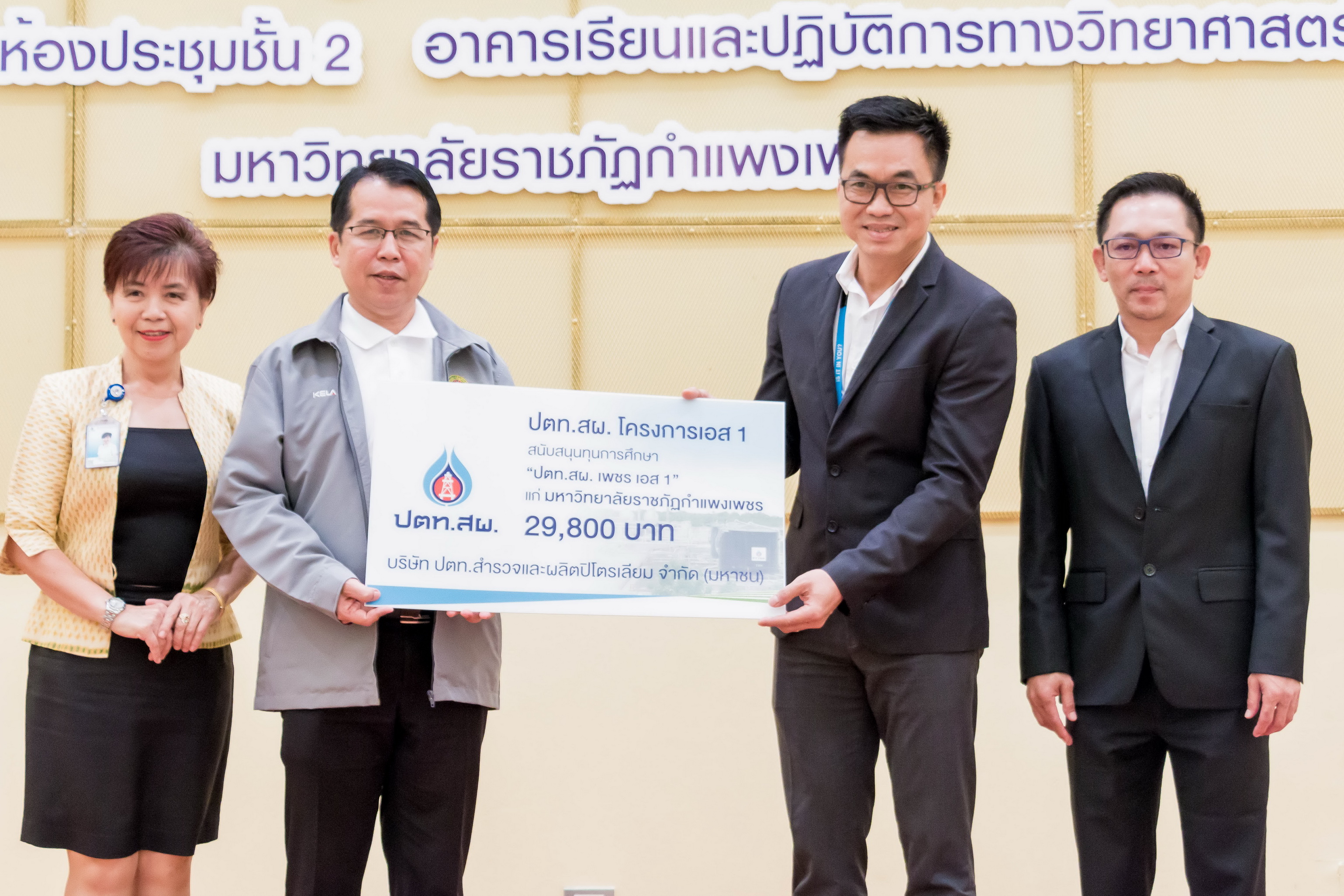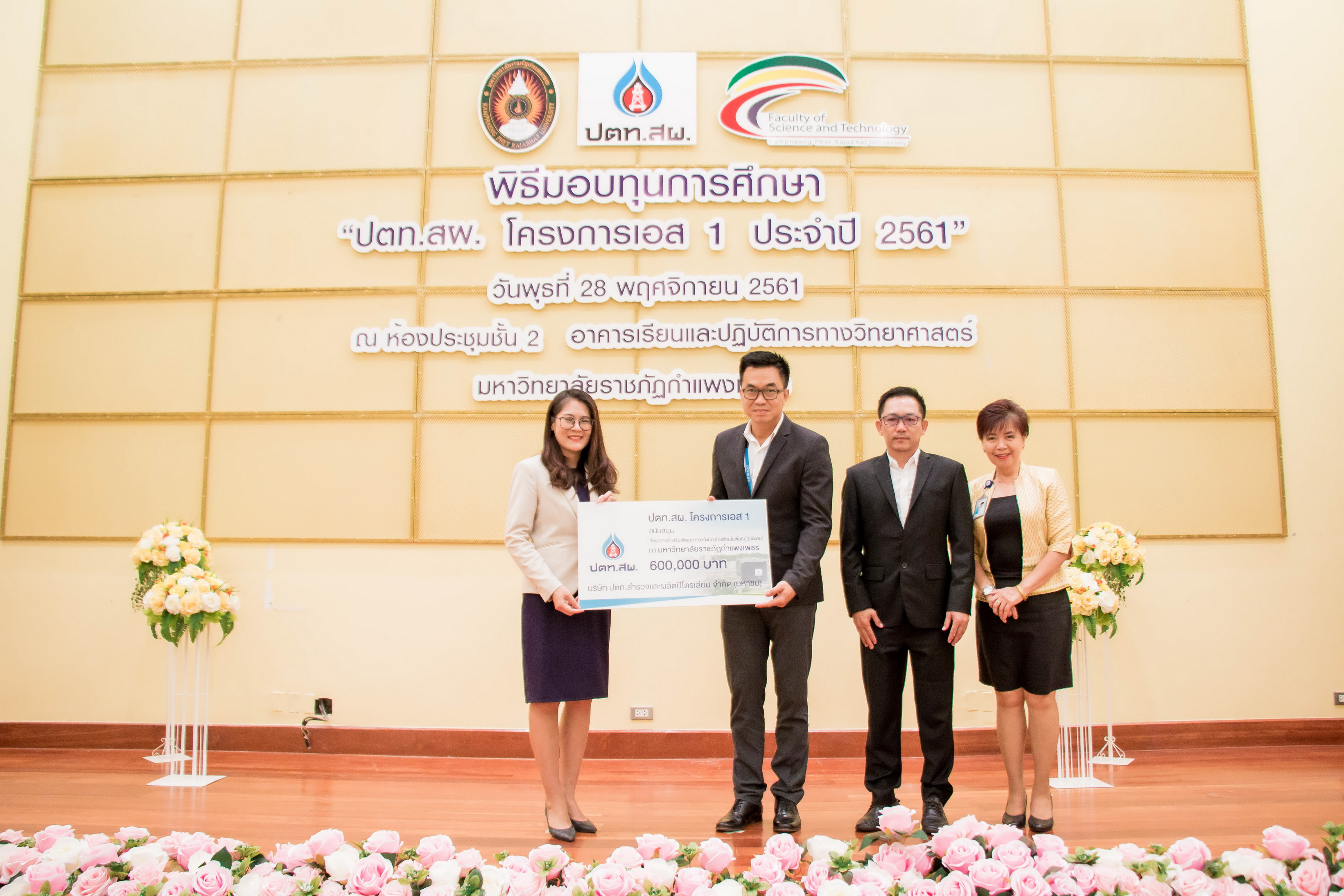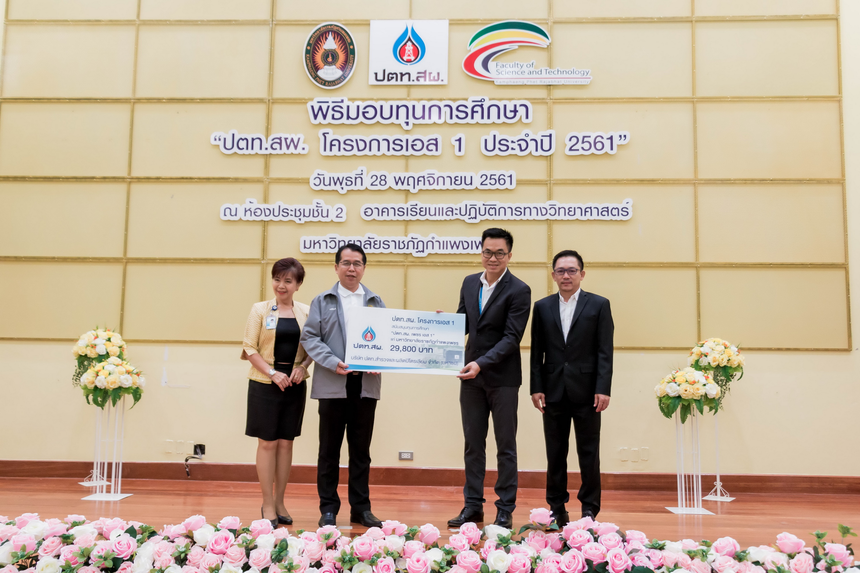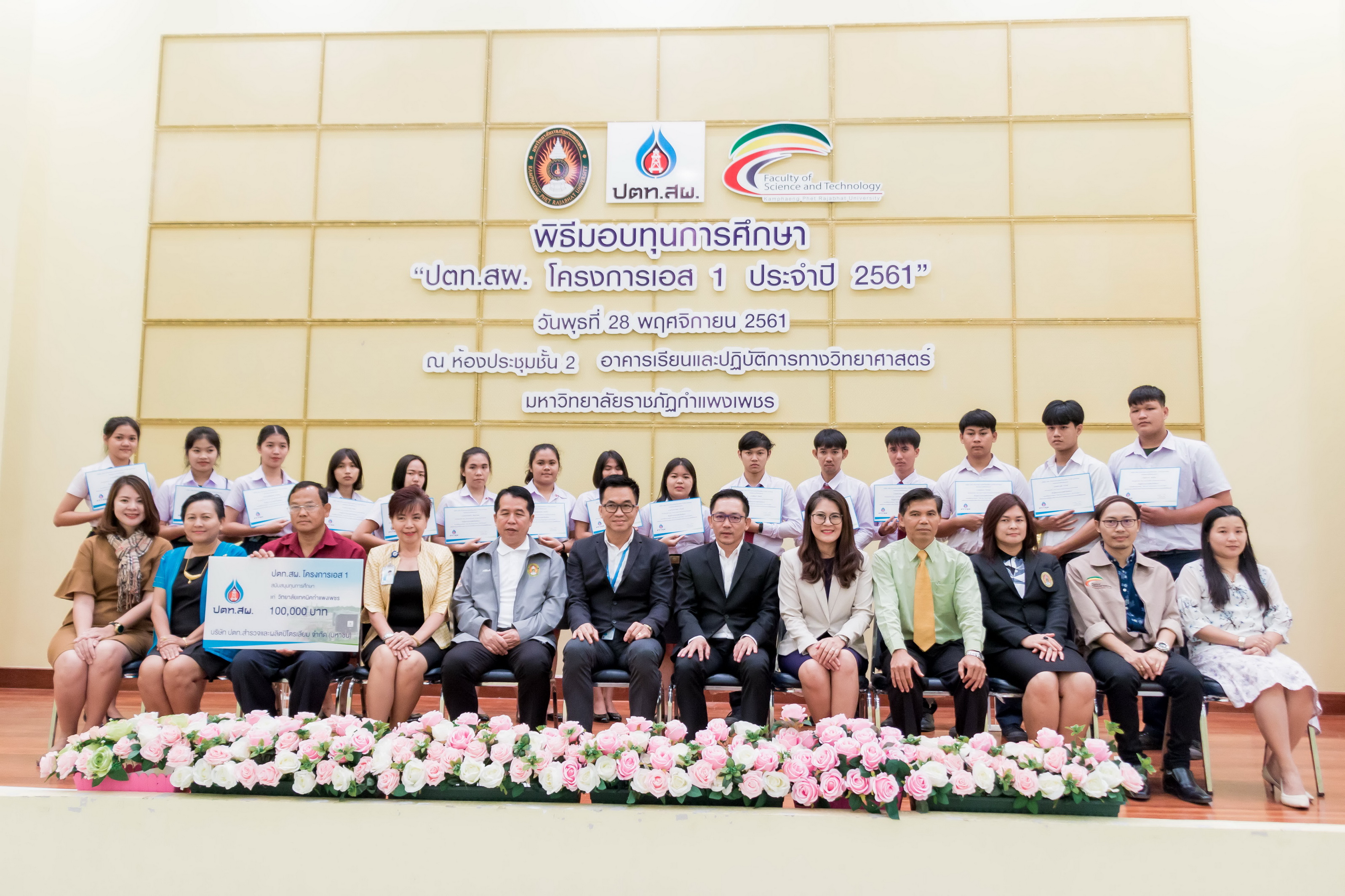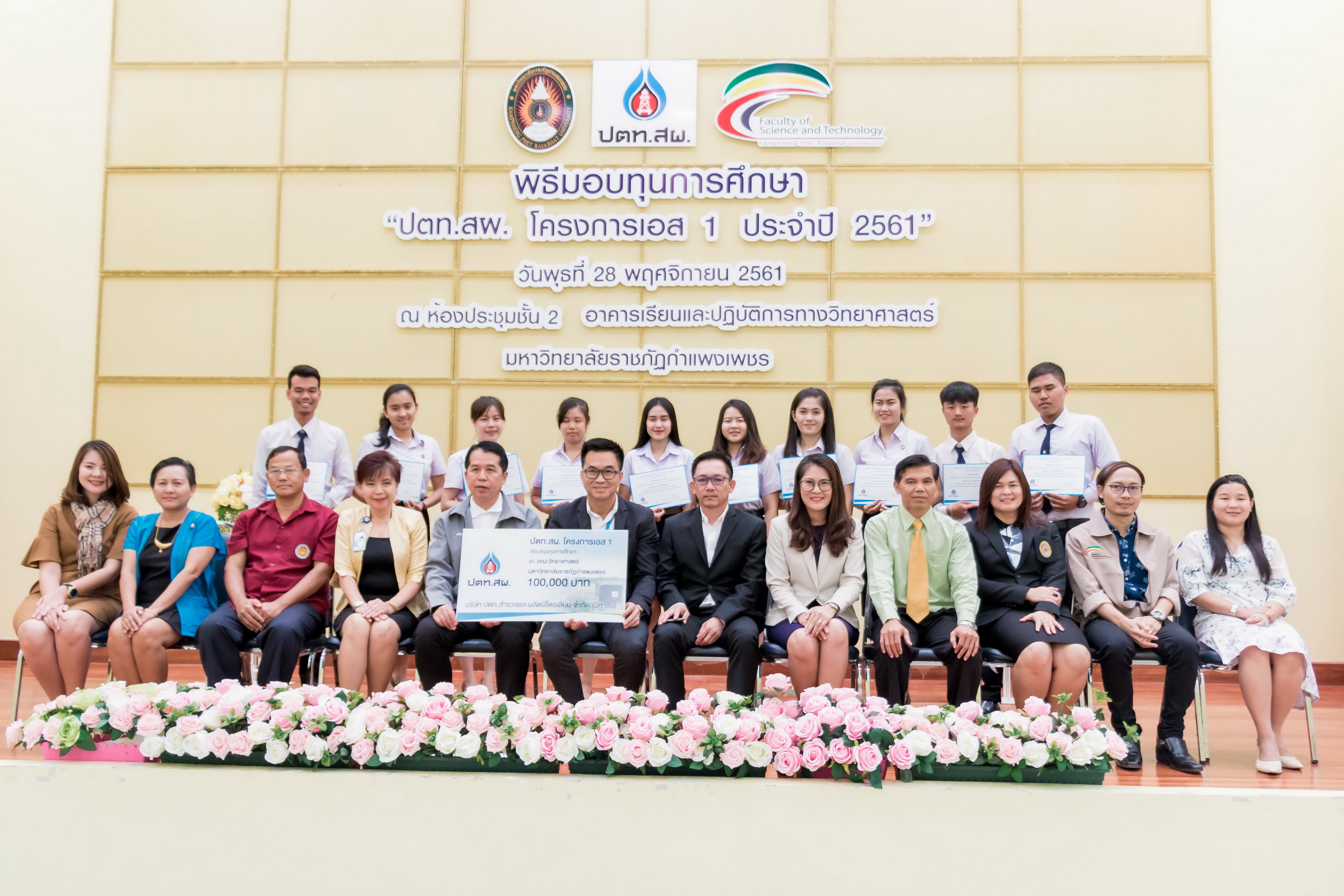 พิธีมอบทุนการศึกษา “ปตท.สผ. โครงการเอส1 ประจำปี 2561 วันที่ 28 พฤศจิกายน 2561 เวลา 11.00-12.00 น. ณ” ห้องประชุมใหญ่ ชั้น 2 (48233) อาคารเรียนและปฏิบัติการทางวิทยาศาสตร์ โดย รองคณบดีฝ่ายกิจการนักศึกษาและศิลปวัฒนธรรม นักศึกษาคณะวิทยาศาสตร์และเทคโนโลยี ให้กับ นักศึกษามหาวิทยาลัยราชภัฏกำแพงเพชร นักศึกษาวิทยาลัยเทคนิคกำแพงเพชร