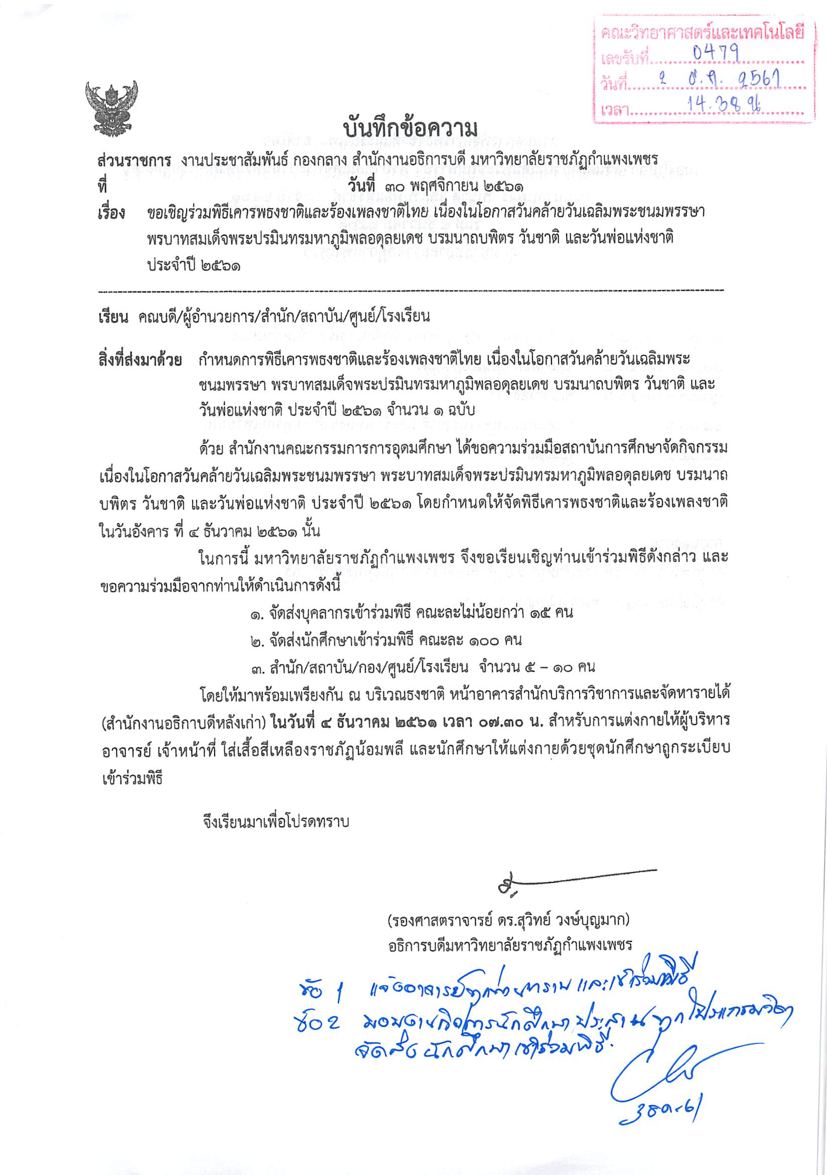 ขอเชิญผู้บริหาร อาจารย์ เจ้าหน้าที่ และนักศึกษามหาวิทยาลัยราชภัฏกำแพงเพชร ร่วมพิธีเคารพธงชาติและร้องเพลงชาติไทย เนื่องในโอกาสวันคล้ายวันเฉลิมพระชนมพรรษา พระบาทสมเด็จพระปรมินทรมหาภูมิพลอดุลยเดช บรมนาถบพิตร วันชาติ และวันพ่อแห่งชาติ ประจำปี 2561
