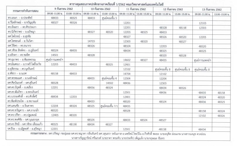 ตารางคุมสอบภาคปกติกลางภาคเรียนที่ 1/2562 คณะวิทยาศาสตร์และเทคโนโลยี